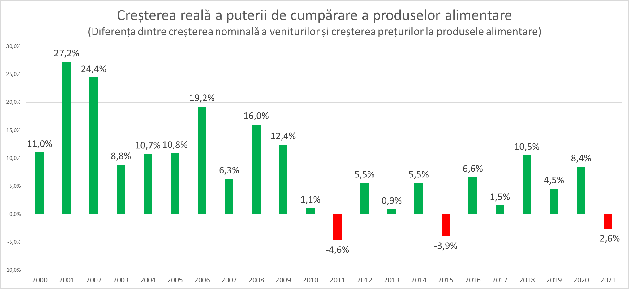 În ultimii 20 de ani este pentru a treia oară, când puterea reală de cumpărare a produselor alimentare în Moldova scade. Astfel în 2021 veniturile populației sub formă de salariu au crescut mai puțin decât creșterea prețurilor la produsele alimentare. Drept consecință pe un salariul în 2021 cetățenii moldoveni au putu procura produse alimentare cu 2,6% mai puțin decât în 2020. Totuși această reducere a puterii de cumpărare în 2021 este cea mai mică, comparativ cu reducerile precedente și se datorează creșterii substanțiale a salariului nominal pe economie, care a reușit să compenseze în cea mai mare parte creșterea prețurilor la produsele alimentare.