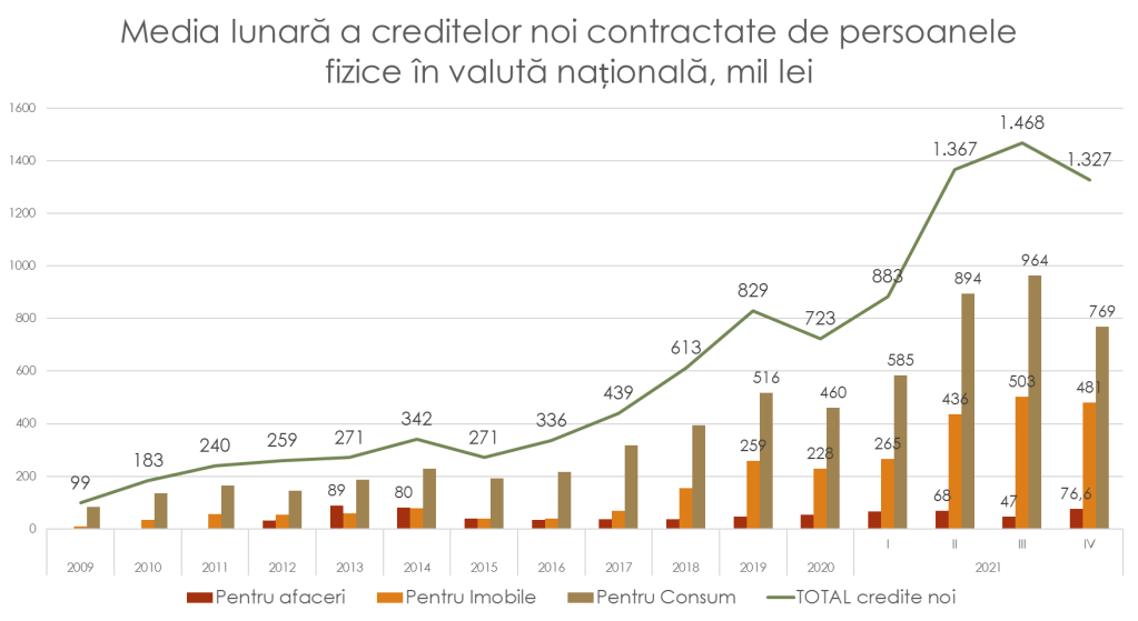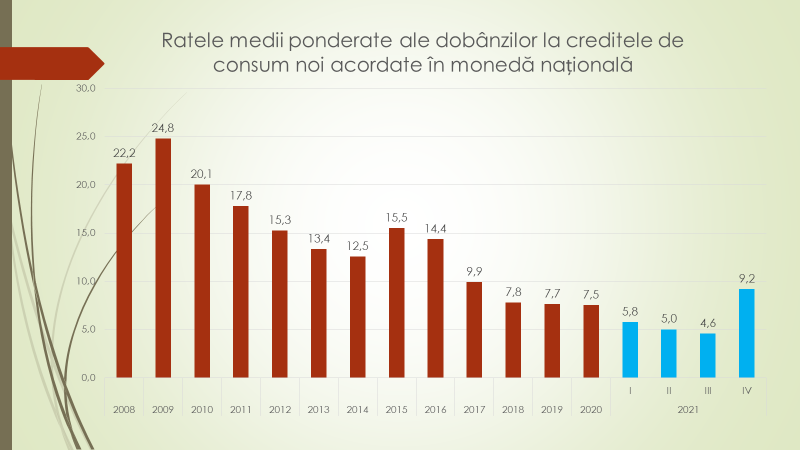 În cazul creditelor de consum, în trimestrul III al anului 2021 rata de bază era la cel mai mic nivel din istoria țării – la 4,6%. Odată cu majorarea ratei de bază de către BNM, creditele de consum au înregistrat cea mai mare creștere din toate tipurile de credite și au ajuns în trimestrul IV la 9,2%, cea ce a și fost scopul de bază a BNM. Efectul imediat al acestei scumpiri s-a manifestat prin reducerea creditelor noi contractate de populație pentru consum de la 4,4 miliarde în trimestrul III, anul trecut, la mai puțin de 4 miliarde lei în Trimestrul IV.