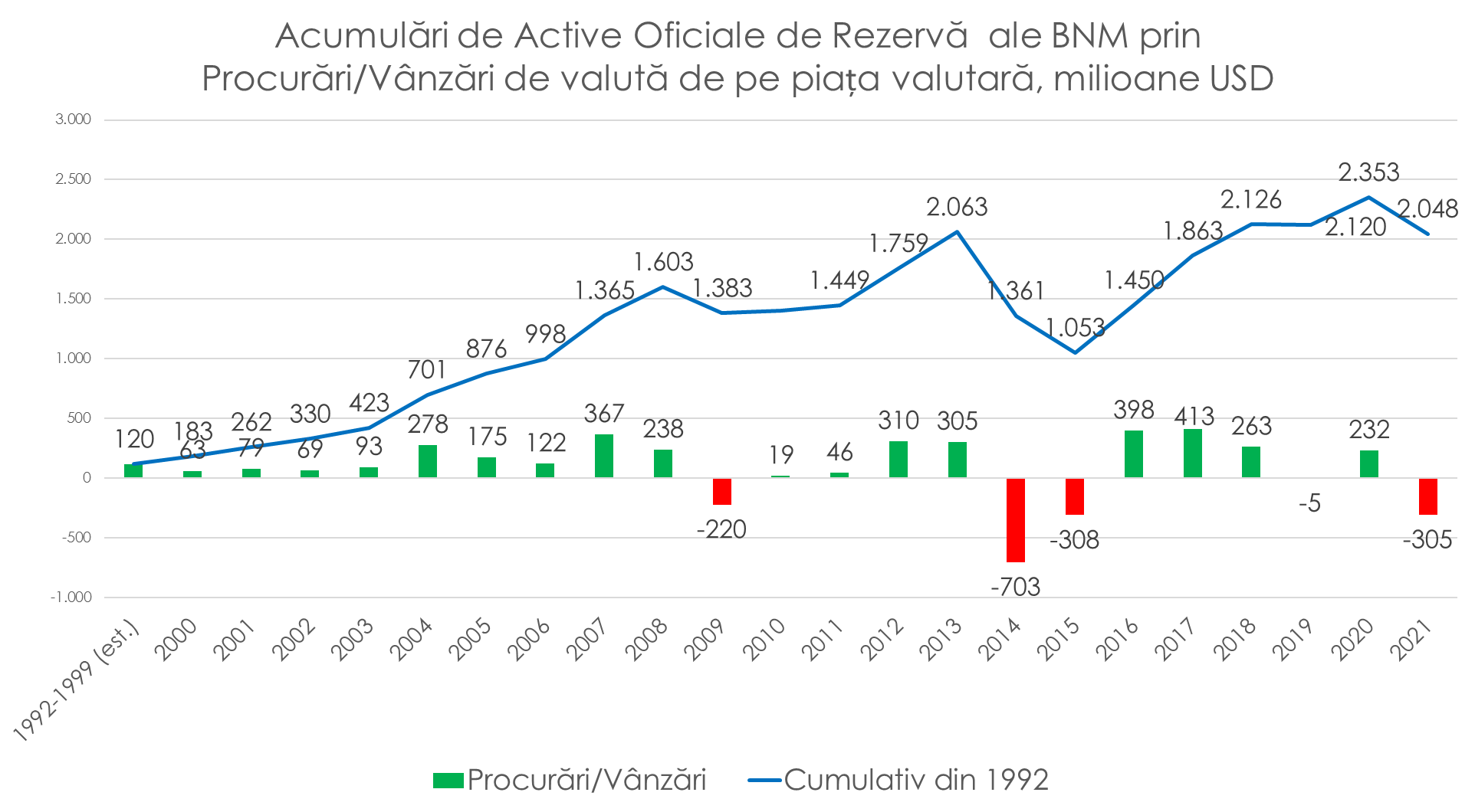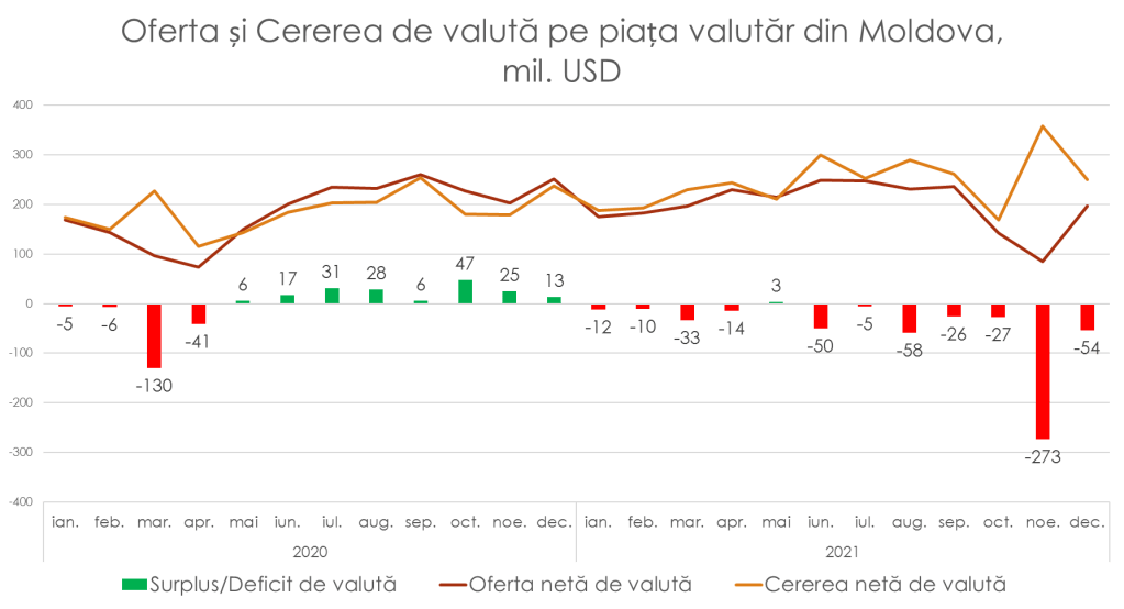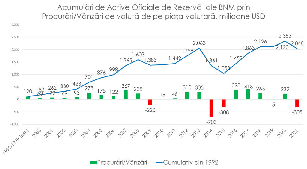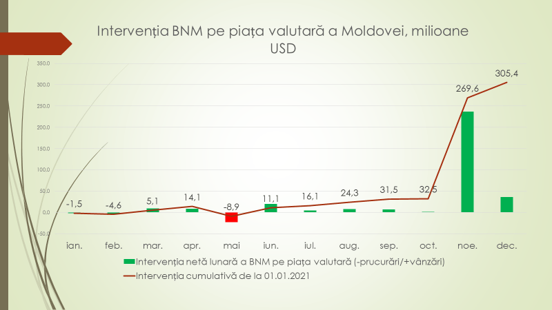 Potrivit expertului, BNM a intervenit masiv pe piața valutară de patru ori în istoria țării: 1998-1999; 2009; 2014-2015 și în 2021 – cu 305 milioane de dolari, lucrul care a permis leului moldovenesc, într-un an de deficit de valută pe piață, când cererea a fost cu mult mai mare decât oferta, să finalizeze anul mai puternic decât la început, față de perechea valutară euro și dolar.