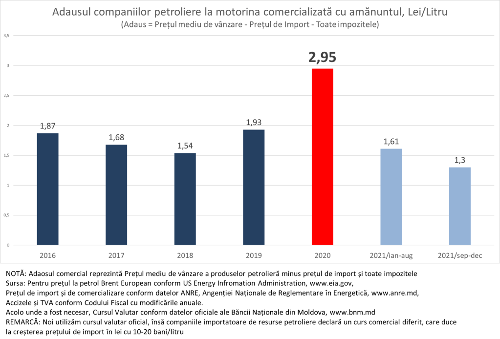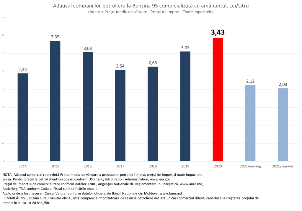 În realitatea marja comercială aplicată de companiile petrolier în 2021 a fost mult mai mică decât cea permisă de ANRE și a fost cea mai mică din ultimii cel puțin 7 ani, pentru care am realizat analiza. Aici noi vorbim de valori absolute, însă dacă analizăm în valori relative, atunci adaosul comercial aplicat de companiile petroliere în 2021 a fost de 12,1%, sau de 2,3 ori mai mic decât în 2020 când el a constituit 27,4% și de 1,7 ori mai mic decât media pentru ultimii 7 ani, când adaosul comercial a fost de 20,7%. Dacă companiile petrolier ar fi aplicat adaosul mediu pentru ultimii 7 ani, atunci benzina în 2021 urma să fie în cu 1,43 lei/litru mai scumpă decât a fost în realitate.