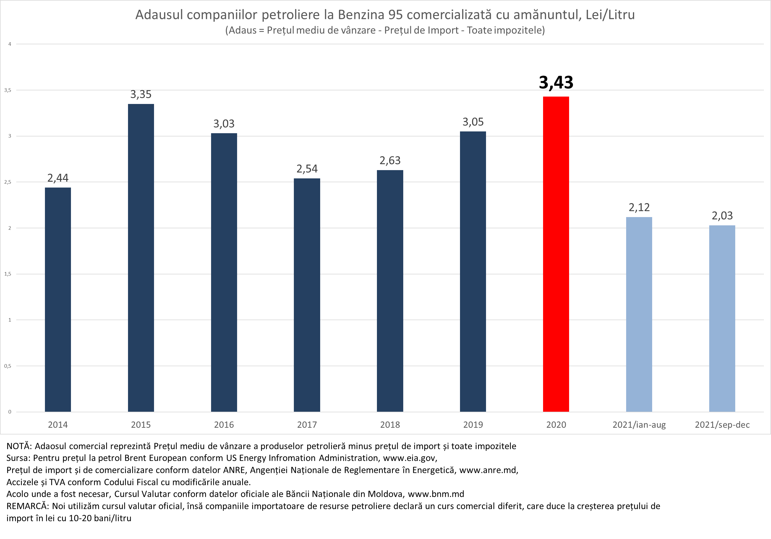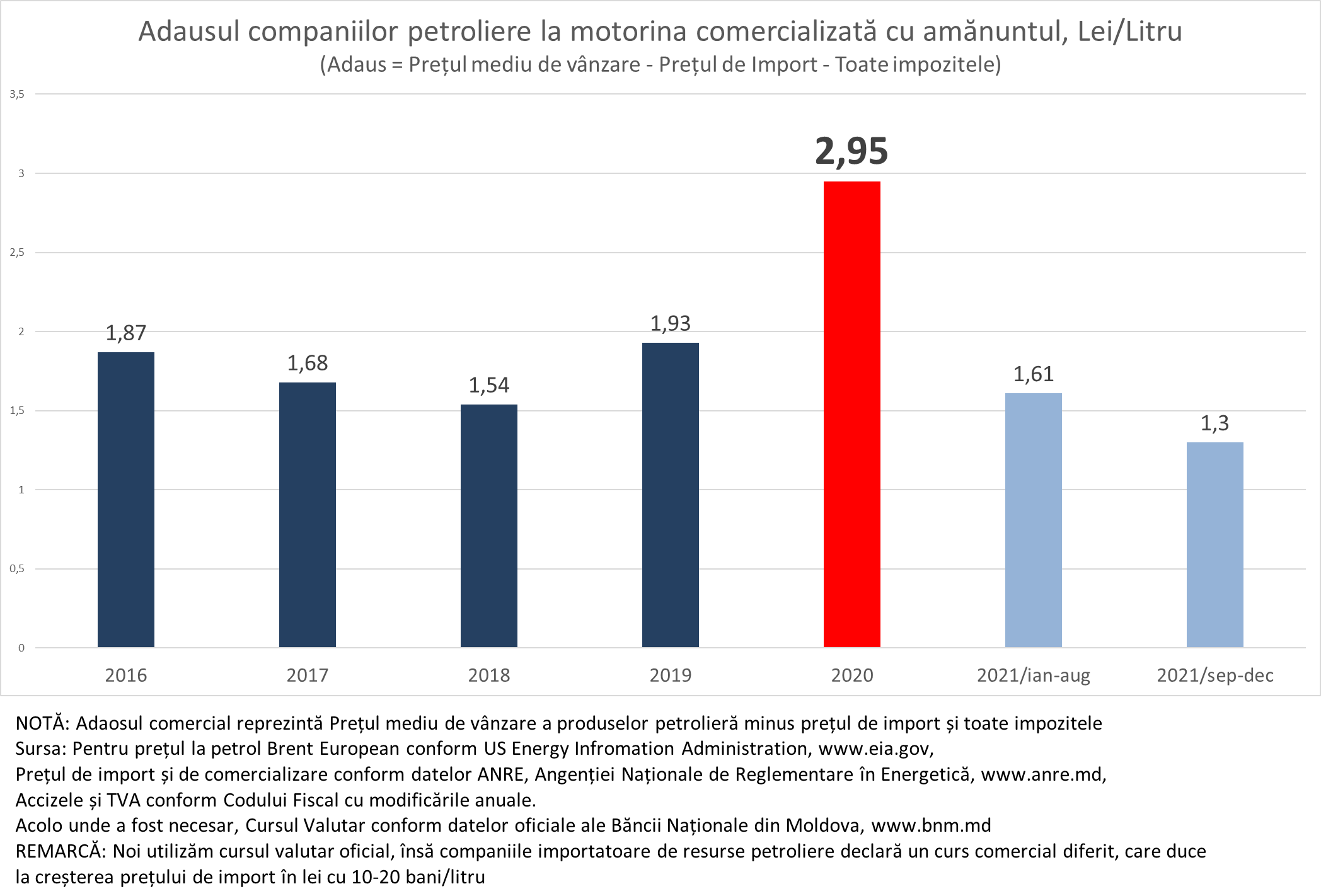 În realitatea marja comercială aplicată de companiile petrolier în 2021 a fost mult mai mică decât cea permisă de ANRE și a fost cea mai mică din ultimii cel puțin 7 ani, pentru care am realizat analiza. Aici noi vorbim de valori absolute, însă dacă analizăm în valori relative, atunci adaosul comercial aplicat de companiile petroliere în 2021 a fost de 12,1%, sau de 2,3 ori mai mic decât în 2020 când el a constituit 27,4% și de 1,7 ori mai mic decât media pentru ultimii 7 ani, când adaosul comercial a fost de 20,7%. Dacă companiile petrolier ar fi aplicat adaosul mediu pentru ultimii 7 ani, atunci benzina în 2021 urma să fie în cu 1,43 lei/litru mai scumpă decât a fost în realitate.