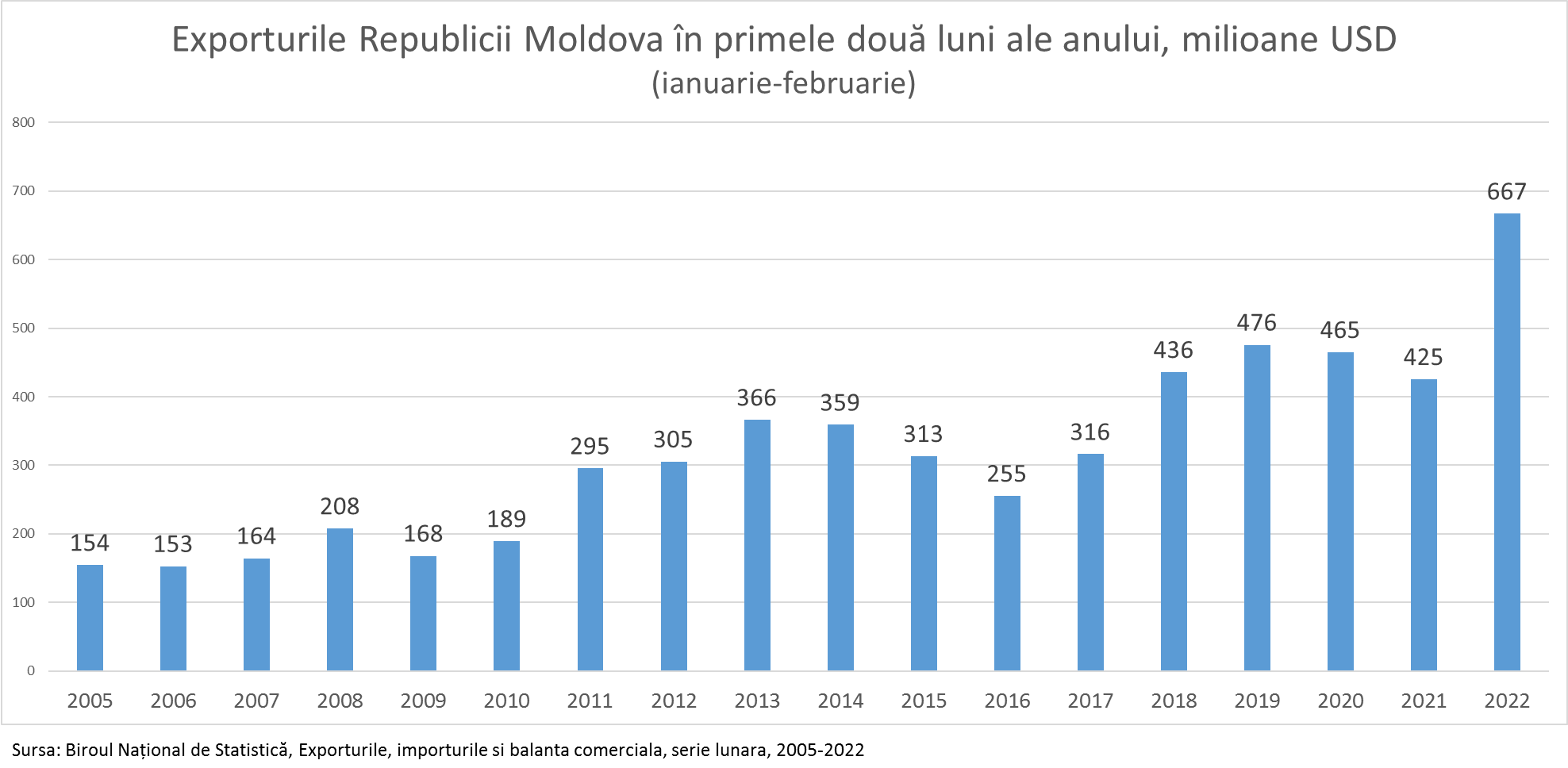 În primele 2 luni ale anului (ianuarie-februarie) exporturile Moldovei au ajuns la 667 milioane USD cea ce este cu 57% mai mult decât media pentru ultimii 5 ani. În valori anuale exporturile Moldovei au ajuns în luna februarie la aproape 3,4 miliarde USD, volum fără precedent în istoria comerțului extern al Moldovei.