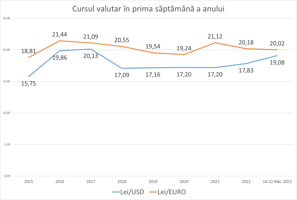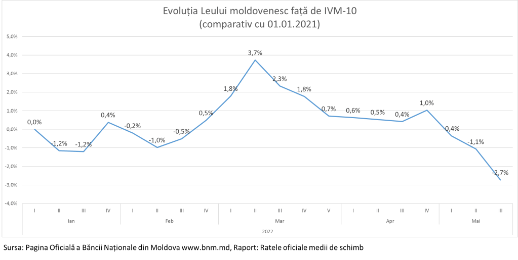 Leul moldovenesc s-a depreciat cu 1,6% față de 10 valute de bază din coșul valutar IVM-10 ajungând cu 2,7% mai slabă decât la începutul acestui an. De la începutul războiului din Ucraina, BNM a intervenit activ pe piața valutară, fapt ce a permis menținerea și chiar aprecierea valutei naționale față de principalele valute de referință din comerțului moldovenesc. Această apreciere a permis evitarea procesului de accelerare a inflației determinate de importuri. Însă pe de altă parte o valută puternică afectează exporturile moldovenești. Din acest motiv pentru noi este clară politica BNM de a relaxa puțin piața valutară, cea ce a dus la o depreciere ușoară a leului moldovenesc pe parcursul a ultimilor trei săptămâni.