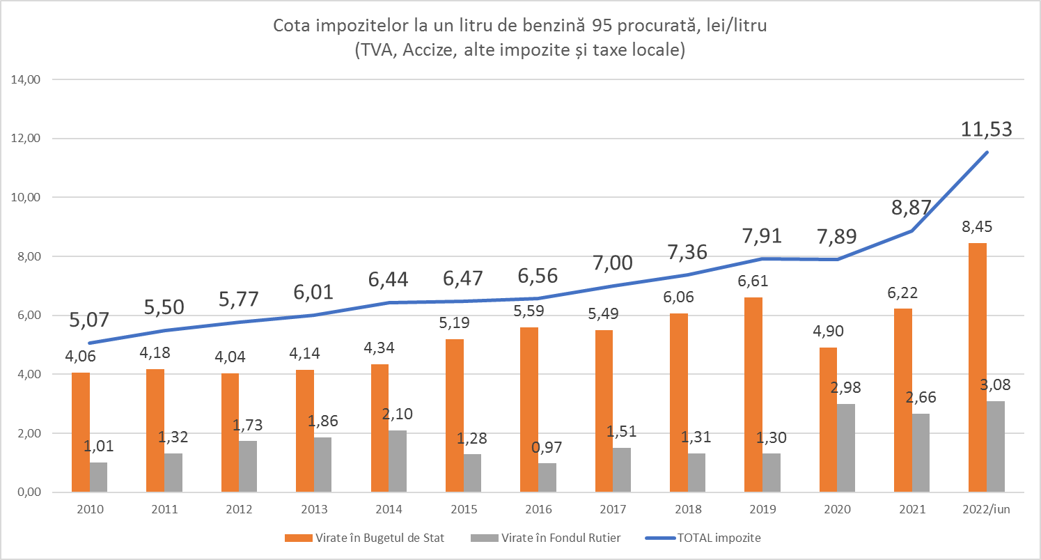 În prezent posesorii de autoturisme achită sub formă de impozite și taxe 11,53 lei, pentru fiecare litru de Benzină procurat. Această sumă este cu 2,66 lei/litru sau 30% mai mult decât au achitat anul trecut.