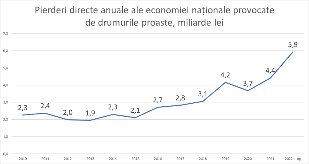 Drumurile proaste, cresc costurile de transport atât a bunurilor cât și a persoanelor. Costurile suplimentare sunt determinate de consum excesiv de produse petrolier, staționare în trafic, reparații suplimentare a unităților de transport, precum și alte cheltuieli. Calculele noastre arată că în acest an pierderile directe ale agenților economici și ale populației determinate de drumurile proaste se vor ridica la 5,9 miliarde lei. Aceste pierderi sunt determinate în cea mai mare parte de plăți suplimentare pentru combustibilul utilizat și reparațiile suplimentare ale unităților de transport.