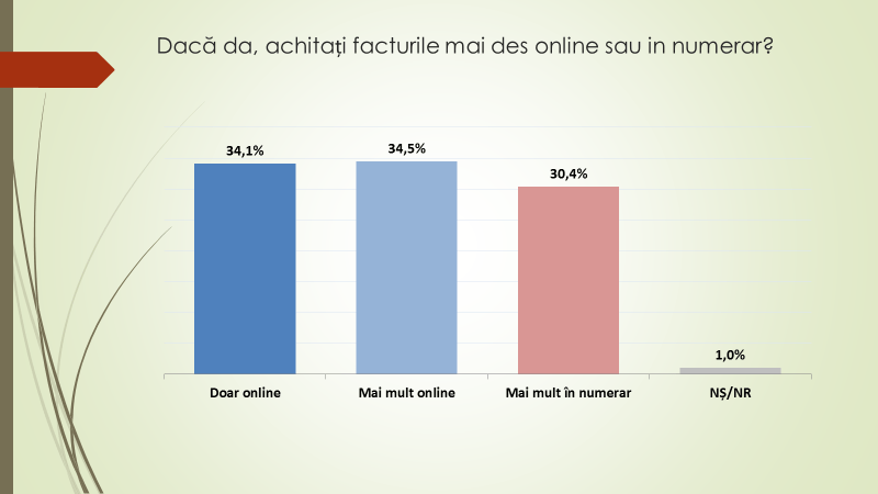 Analistul economic a mai menționat că respondenții au fost întrebați: achită facturile mai des online sau în numerar. Astfel, 34,5% au spus că mai mult online, 34,1% – doar online, 30,4% – mai mult în numerar, 1% nu au știut ce să răspundă sau nu au dorit să răspundă. „Observăm că în Republica Moldova avem 10% din populație care achită deja facturile doar online”, a spus expertul.