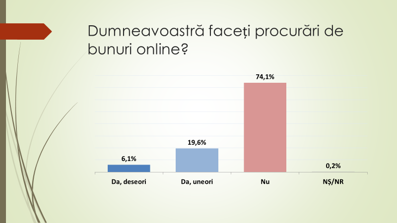 Tot din sondaj a reieșit că 74,1% dintre moldoveni nu fac procurări online de bunuri și servicii; alții 19,6% au spus că fac uneori. Doar 6,1% au spus că da; iar 0,2% nu au răspuns. Din rândul tinerilor de 18-29 de ani, 51,5% au spus că fac procurări de bunuri și servicii online, cei de vârstă de 30-44 de ani reprezintă 35,2%, de la 45 la 59 de ani – 16,2%, iar cei de 60 de ani și peste – 5%. „Și când vine vorba de procurări de bunuri și servicii online studiile au o influență destul de mare. 45,8% dintre moldoveni cu studii superioare fac procurări de bunuri online, 21,2% au studii profesional tehnice; 17,4% – medii generale, iar 6,6% cu studii medii incomplete”, a mai declarat expertul.