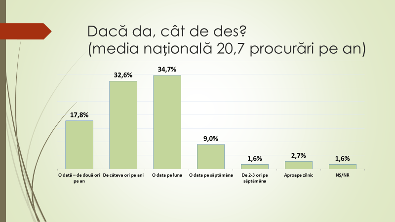 Veaceslav Ioniță a mai menționat că cei care fac procurări online au fost întrebați cât de des fac acest lucru. Astfel, 34,7% au spus că o dată pe lună; 32,6% – de câteva ori pe an; 17,8% – o dată, de două ori pe an; 9% – o dată pe săptămână; 2,7% – aproape zilnic; 1,6% – de două sau trei ori pe săptămână; 1,6% nu au răspuns. „Oamenii încă nu au experiență. Avem un număr mic de oameni care spun că fac procurări online zilnic. Doar pentru 4,5% dintre cetățeni comerțul online este ceva obișnuit. Este foarte mare numărul celor pentru care achitările online este ceva sporadic”, a declarat economistul.