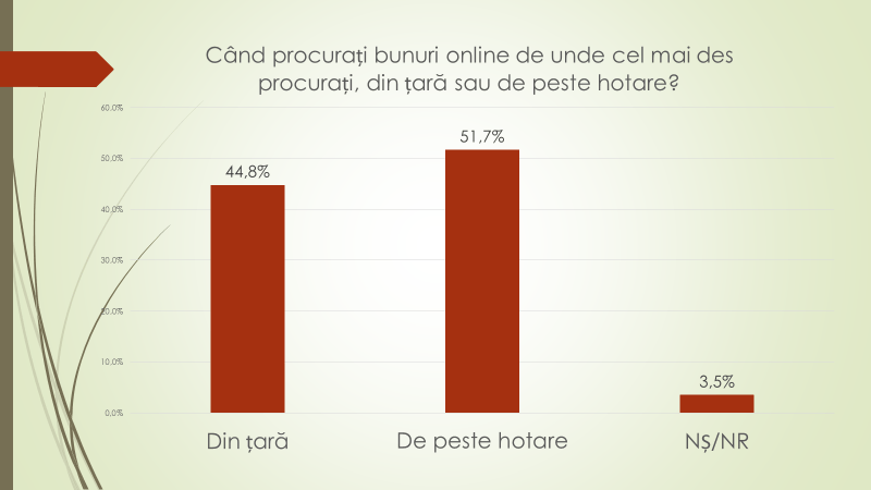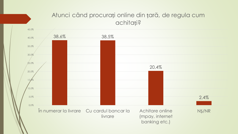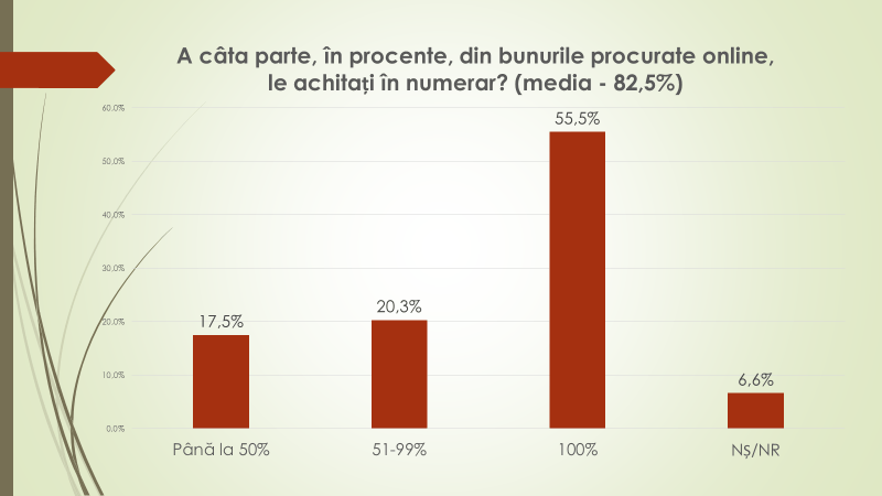 Fiind întrebați de unde în mare parte procură online anumite bunuri, 51,7% dintre moldoveni au menționat că de peste hotare; 44,8% – din țară; iar 3,5% nu au răspuns. Atunci când procură online din țară, 38,6% achită în numerar la livrare; 38,5% – cu cardul bancar la livrare; 20,4% online prin mpay, internet banking etc); 2,4% nu au răspuns. La întrebarea a câta parte din bunurile procurate online sunt achitate în numerar, 55,5% au spus că 100%; 20,3% – de la 51 la 99%; 17,5% – până la 50%, iar 6,6 – nu au răspuns..