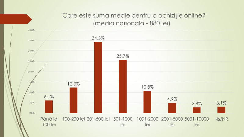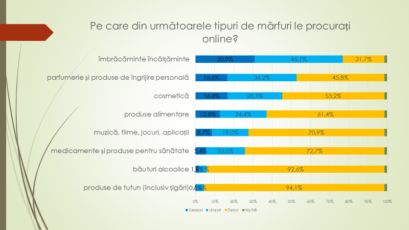Referitor la tipurile de produse procurate online, pe primul loc este îmbrăcămintea și încălțămintea; urmate de parfumurile și produsele de îngrijire personală; cosmetică; produse alimentare; muzică, filme, jocuri și aplicații; medicamente și produse pentru sănătate; băuturi alcoolice; produse de tutun etc. Despre suma medie pentru o achiziție online: 34,3% dintre respondenți au menționat că cheltuie de la 201 lei la 500 de lei; 25,7% – de la 501 lei la 1000 de lei; 12,3% – de la 100 de lei la 200 de lei; 10,8% – de la 1001 lei la 2000 de lei; 6,1% – până la 100 de lei; 4,9% – de la 2001 lei la 5000 de lei; Nu știu/Nu răspund – 3,1%; 2,8% – de la 5001 lei la 10 mii de lei. „La noi bunurile procurate online nu sunt de valoare mare. Un număr destul redus de persoane achită bunuri online de mai mult de 2000 de lei”, a remarcat Veaceslav Ioniță.