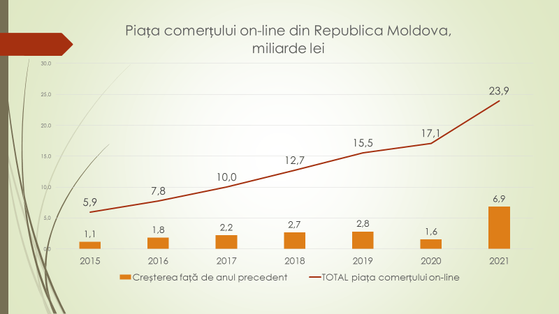 Economistul a mai afirmat că în 2021 piața online în Republica Moldova a ajuns la 23,9 de miliarde de lei, cea mai mare din toată istoria țării. În creștere cu 7 miliarde de lei față de 2020. În 2015 piața online era de aproape 6 miliarde de lei, în 2016 a ajuns la aproape 8 miliarde de lei, în 2017 – 10 miliarde de lei, 2018 – 12,7 miliarde de lei; 2019 – 15,5 miliarde de lei, iar în 2020 – 17,1 miliarde de lei.