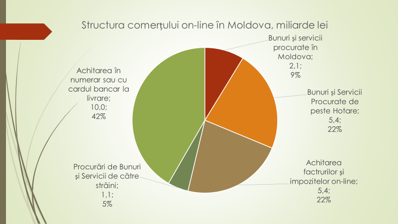 Potrivit analistului economic, piața online din Republica Moldova este formată din: 10 miliarde de lei sau 42% din achitarea în numerar sau cu cardul bancar la livrarea produselor și serviciilor; din 5,4 miliarde de lei sau 22% din bunuri și servicii procurate de peste hotare; din 5,4 miliarde de lei sau 22% din achitarea facturilor și impozitelor online; din 2,1 miliarde de lei sau 9% din bunuri și servicii procurate în țară; și din1,1 miliarde de lei sau 5% din procurări de bunuri și servicii de către străini.