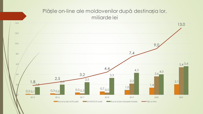 Din plățile oficiale pe care le fac moldovenii, circa 13 miliarde de lei în 2021, 2,1 miliarde de lei au mers pentru procurarea de bunuri și servicii din țară, 5,4 miliarde de lei – pentru achitarea facturilor în Republica Moldova, iar 5,6 miliarde de lei – pentru bunuri și servicii de peste hotare. Procurări de bunuri și servicii din țară s-au făcut în sumă de 10 miliarde de lei în numerar sau cu cardul bancar la livrare, după ce comanda s-a făcut online, iar 3,2 miliarde de lei s-a plătit online. În 2021, oficial s-au făcut achitări online în sumă de 8,6 miliarde de lei, dintre care 7,5 miliarde de lei făcute de pe carduri bancare moldovenești, iar 1,1 miliarde de lei de pe cardurile străine.