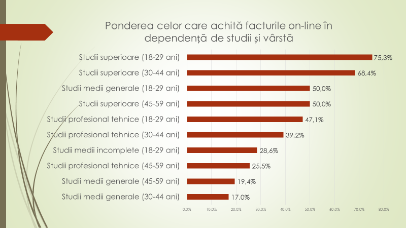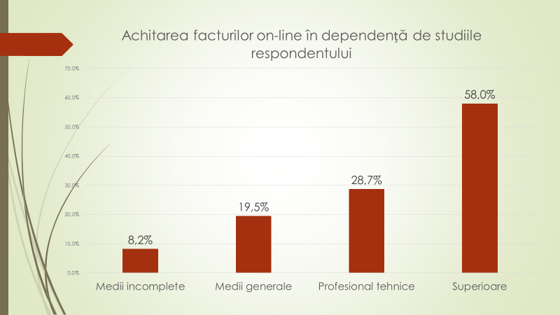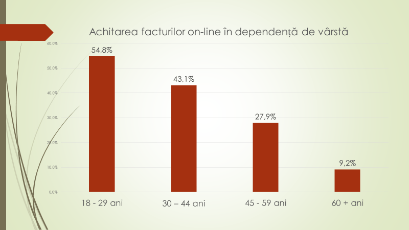 Economistul afirmă că sunt doi factori care îi determină pe moldoveni să facă sau nu achitări online. Este vorba de vârsta și studiile. Din grupul de vârstă 18-29 de ani – 55% dintre respondenți au menționat că achită facturile online permanent sau deseori. La polul opus sunt persoanele care au trecut de 60 de ani. Fiecare a zecea persoană de peste 60 de ani a spus că a încercat măcar o dată să achite facturile online. Dintre persoanele care au studii superioare, 58% achită facturile online, cele cu studii profesional tehnice reprezintă – 28,7%, cu studii medii generale – 19,5%, iar cu studii medii incomplete – 8,2%.