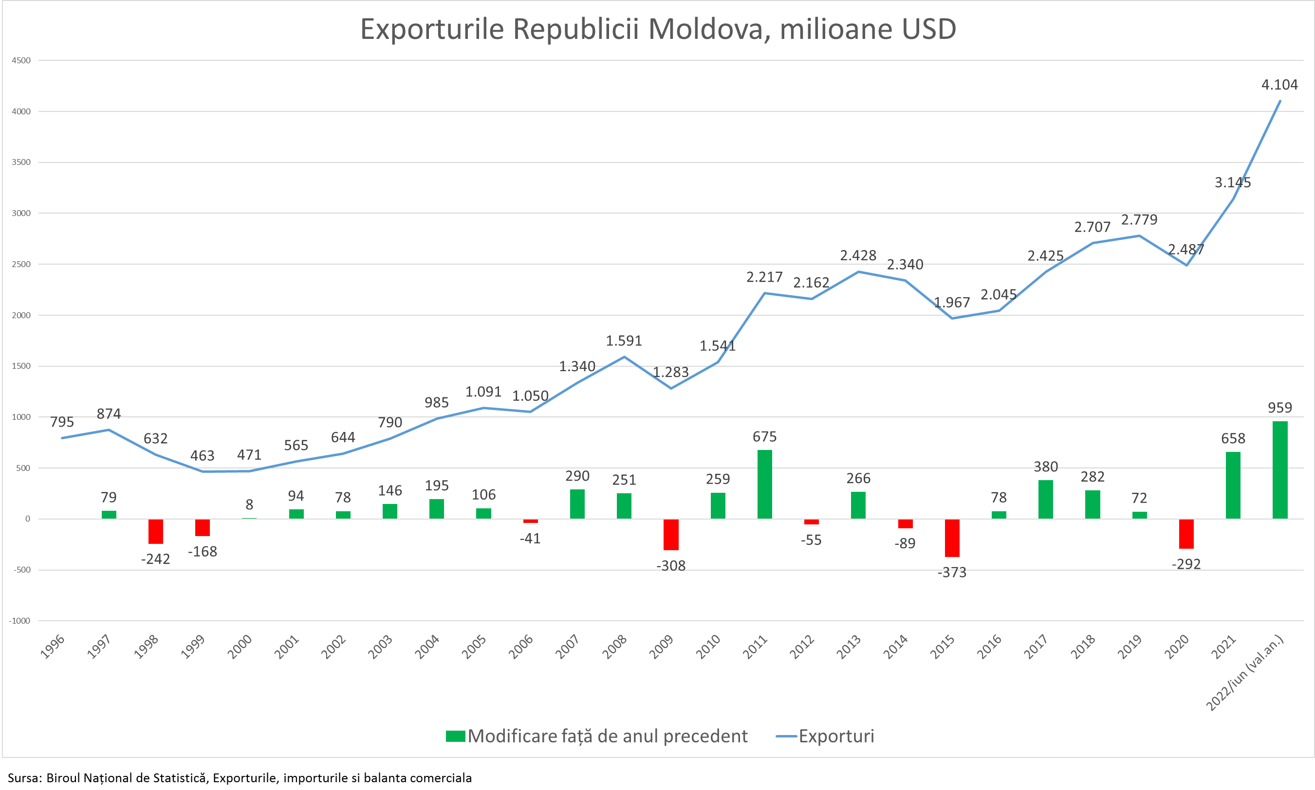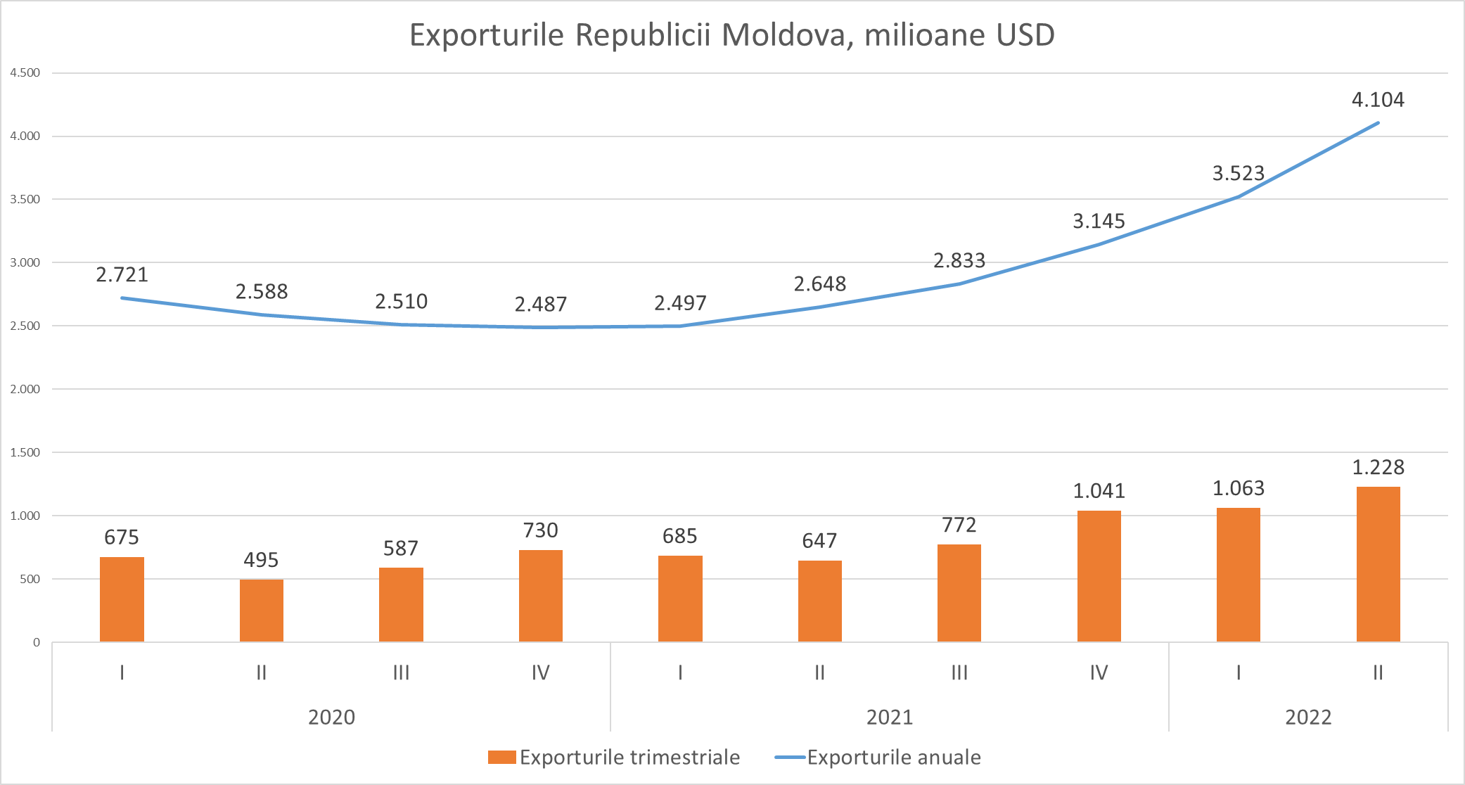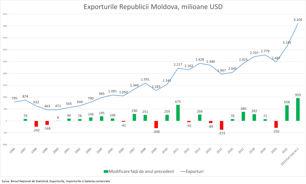 Exporturile moldovenești în prima jumătate a anului au crescut cu 72% față de perioada similară a anului trecut. Am exportat bunuri în valoare de 2,3 miliarde USD sau cu 959 milioane USD față de anul trecut când am exportat în volum de 1,33 miliarde USD. Creșterea dată este una fără precedent în istoria Moldovei, recordul anterior a fost stabilit în 2011, când am înregistrat o creștere de două ori mai mică de 37%.