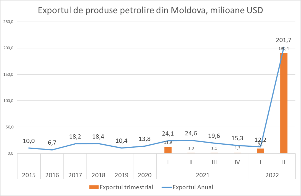Primul factor este războiul din Ucraina, care a dus la creșterea re-exporturilor de mărfuri moldovenești, dar cel mai importat, este reexportul de bunuri spre Ucraina. Cel mai clar acest fenomen poate fi observat în privința produselor petroliere. Moldova anual exporta produse petroliere în valoare de 10-20 milioane USD. În Trimestrul II din 2022, exporturile au crescut de 50 ori până la 190 milioane USD într-un singur trimestru. Dacă lucrurile vor continua în același ritm, avem toate șansele ca produsele petroliere în 2022 să devină principalul produs de export al Moldovei.