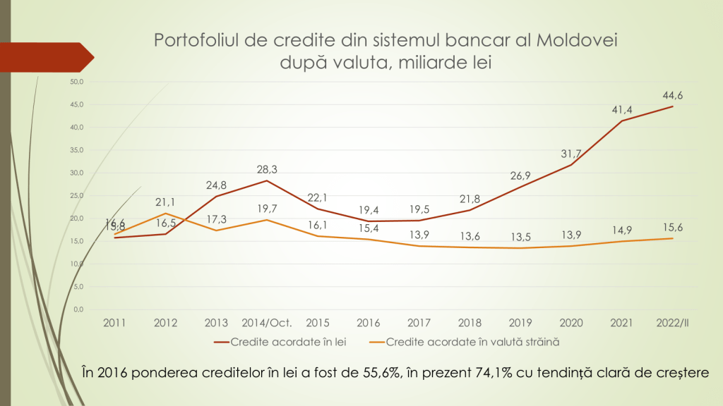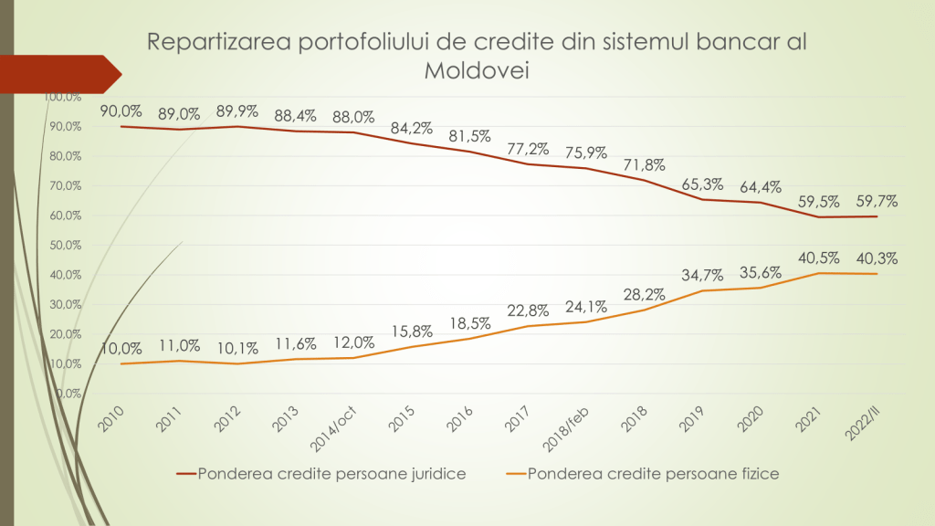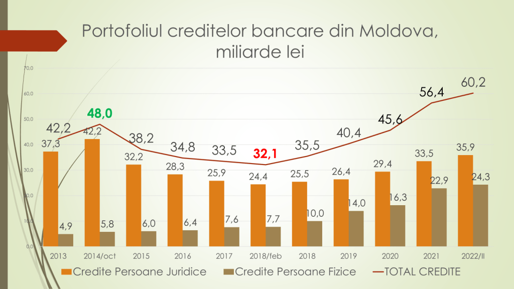 Analistul economic menționează că acum este o schimbare a situației privind repartizarea portofoliului de credite din sistemul bancar. În 2014, până la jaful bancar, agenții economici dețineau 88% dintre toate creditele luate de la bănci, iar populația – 12%. După jaful bancar, creditarea agenților economici s-a redus puternic. În 2021 aceștia aveau până la 60% dintre credite luate, iar populația peste 40%. Acum, în 2022, este o stabilizare a situației, chiar cu o tendință de creștere a creditării agenților economici. Politica monetară dură a BNM a dus la aceasta, iar pe de altă parte a făcut ca populația să nu mai ia credite de la bănci, dar de la companiile de finanțare nebancare.