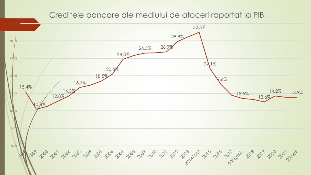 Vorbind despre gradul de îndatorare al mediului de afaceri, raportat la PIB, expertul a precizat că valoarea maximă a fost atinsă în 2014, când agenții economici aveau contractate credite în volum de 32,5% din PIB. În 2019 s-a ajuns la nivelul de 12,6%, cum a fost în anii 2001-2002. Din 2019 și până în prezent este la mai puțin de 14% din PIB. „În prezent volumul de credite acordat agenților economici, raportat la PIB, este de aproape 2,5 ori mai puțin decât a fost în 2014, înainte de jaful bancar. Recuperarea, prin prisma creditării agenților economici, raportat la PIB, va lua încă cel puțin 10 ani. Creșterea este foarte lentă”, a spus expertul.