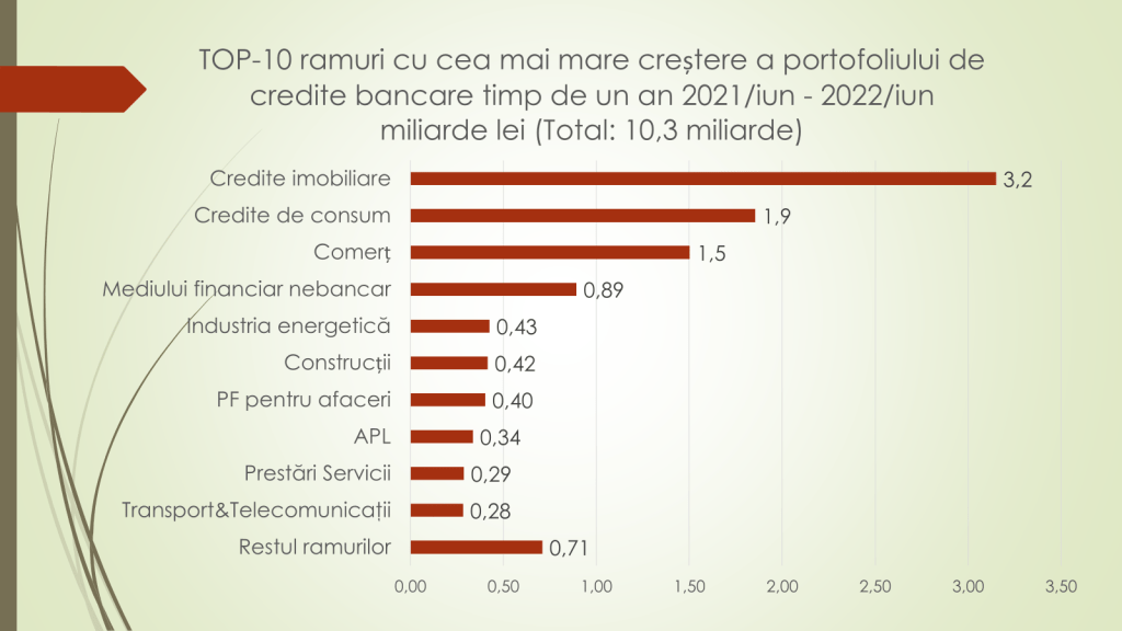 Veaceslav Ioniță susține că din iunie 2021 și până în iunie 2022 volumul de credite în sectorul bancar a crescut cu 10,3 miliarde de lei. 6,4 în a doua jumătate a anului trecut și 3,8 în prima jumătate a acestui an. Astfel, 3,2 miliarde de lei au mers către credite imobiliare, altele 1,9 miliarde de lei pentru credite de consum. 1,5 miliarde de lei pentru comerț. Mediul financiar nebancar s-a creditat cu 890 de milioane de lei. Pentru dezvoltarea sectorului energetic s-au luat credite de 430 de milioane de lei; pentru construcții – 420 de milioane de lei etc. „Creșterea portofoliului de credite în decurs de un an a fost fie pentru finanțarea directă a consumului populației, fie finanțarea ramurilor care lucrează pentru consumul populației. Avem o economie bazată pe consum, producție absolut deloc nu este și tot portofoliul de credite a crescut exclusiv datorită populației”, a declarat Ioniță.