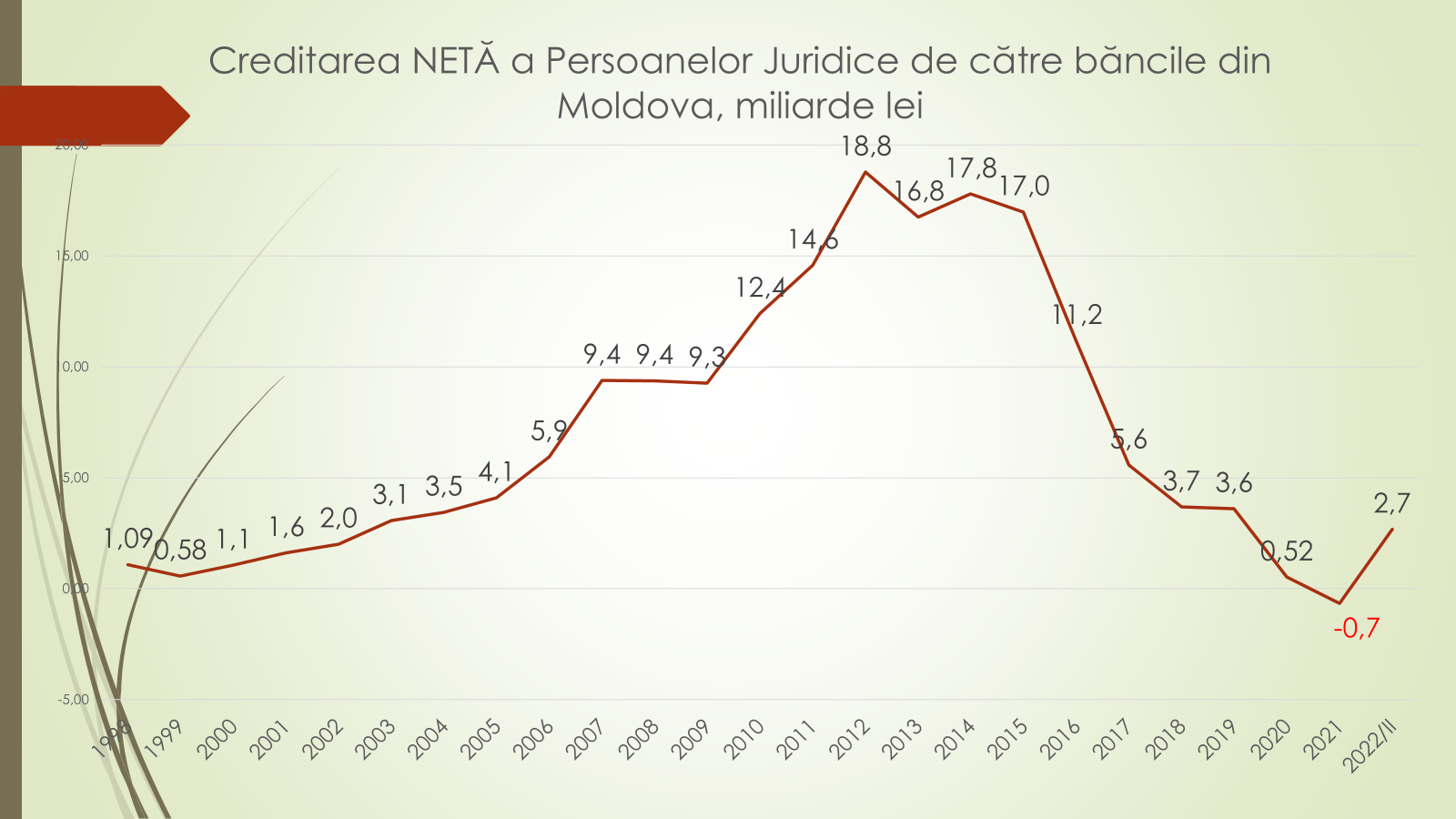 Potrivit expertului, creditarea netă a agenților economici este diferența dintre volumul creditelor contractate și volumul depozitelor din bănci. Și în totdeauna creditarea netă a fost pozitivă. În 2021 a ajuns la 19 miliarde de lei. Însă, în 2021 creditarea netă a businessului a fost negativă, de minus 700 de milioane de lei. „Agenții economici au ținut mai mulți bani în bănci decât au luat credite. Din cauza situației economice incerte, din ne dorința de a investi, banii i-au ținut în bănci și nu i-au investit. Din contra, au sustras banii puși pentru investiții, i-au pus în bancă, iar populația a luat credite de consum. Așa ceva nu a fost niciodată în istoria țării și cel mai probabil nu va mai fi niciodată”, a spus expertul.