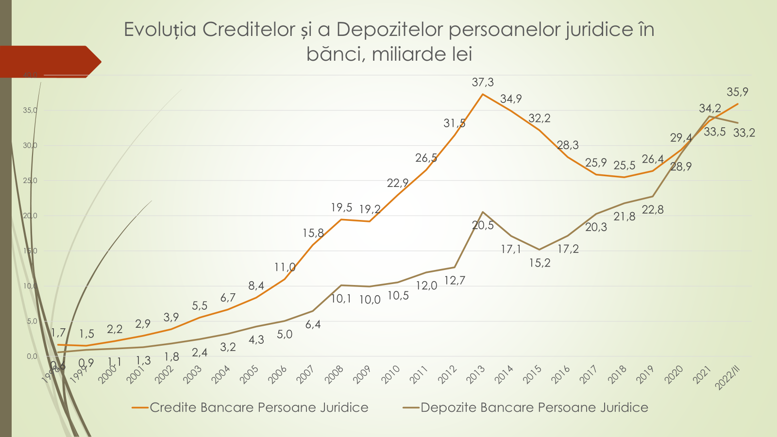 Vorbind despre gradul de îndatorare al mediului de afaceri, raportat la PIB, expertul a precizat că valoarea maximă a fost atinsă în 2014, când agenții economici aveau contractate credite în volum de 32,5% din PIB. În 2019 s-a ajuns la nivelul de 12,6%, cum a fost în anii 2001-2002. Din 2019 și până în prezent este la mai puțin de 14% din PIB. „În prezent volumul de credite acordat agenților economici, raportat la PIB, este de aproape 2,5 ori mai puțin decât a fost în 2014, înainte de jaful bancar. Recuperarea, prin prisma creditării agenților economici, raportat la PIB, va lua încă cel puțin 10 ani. Creșterea este foarte lentă”, a spus expertul.