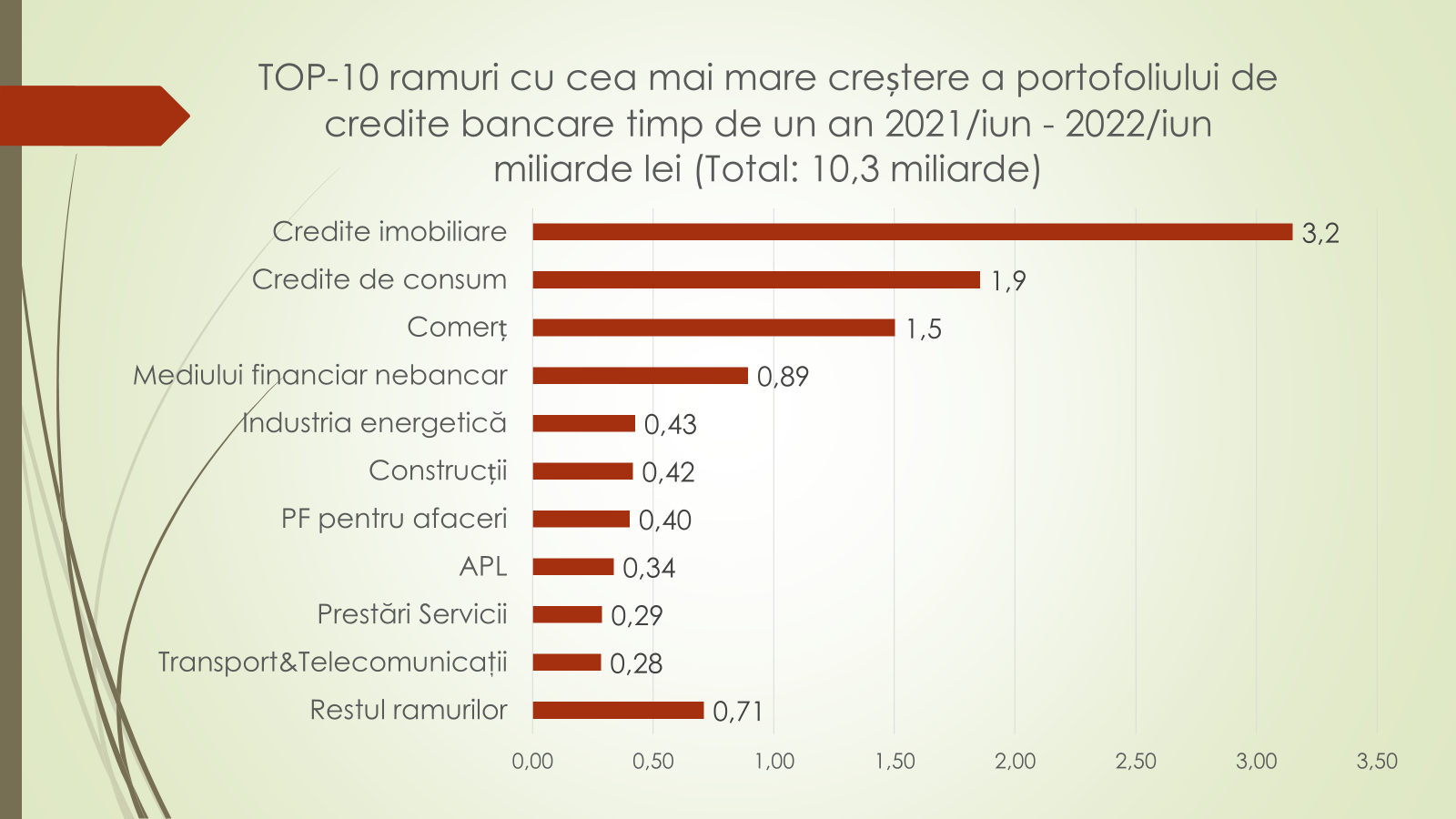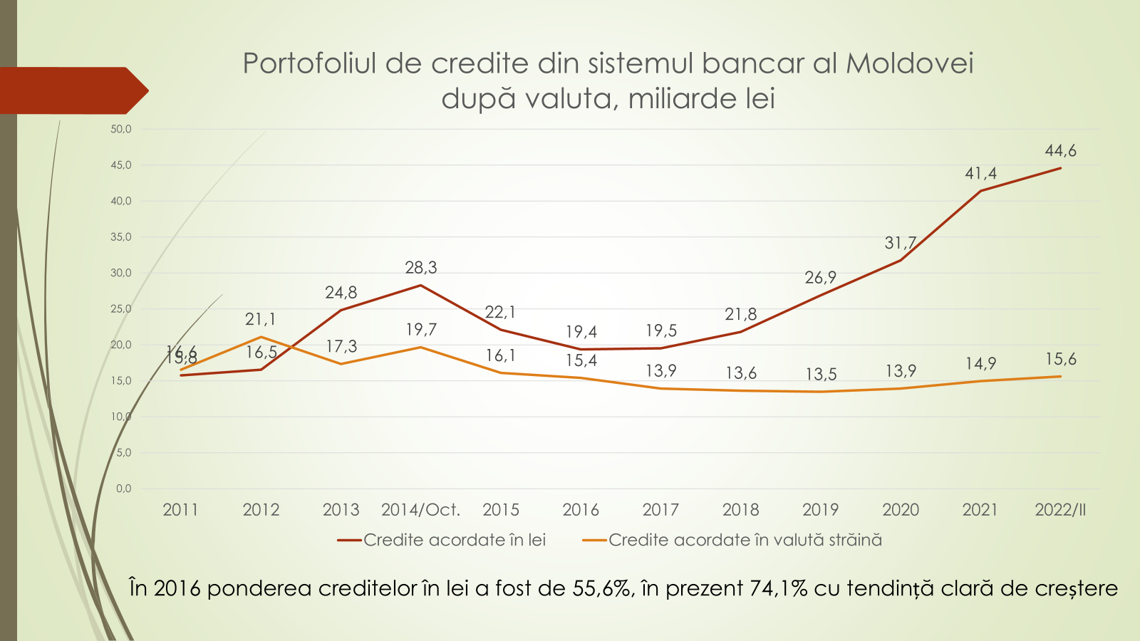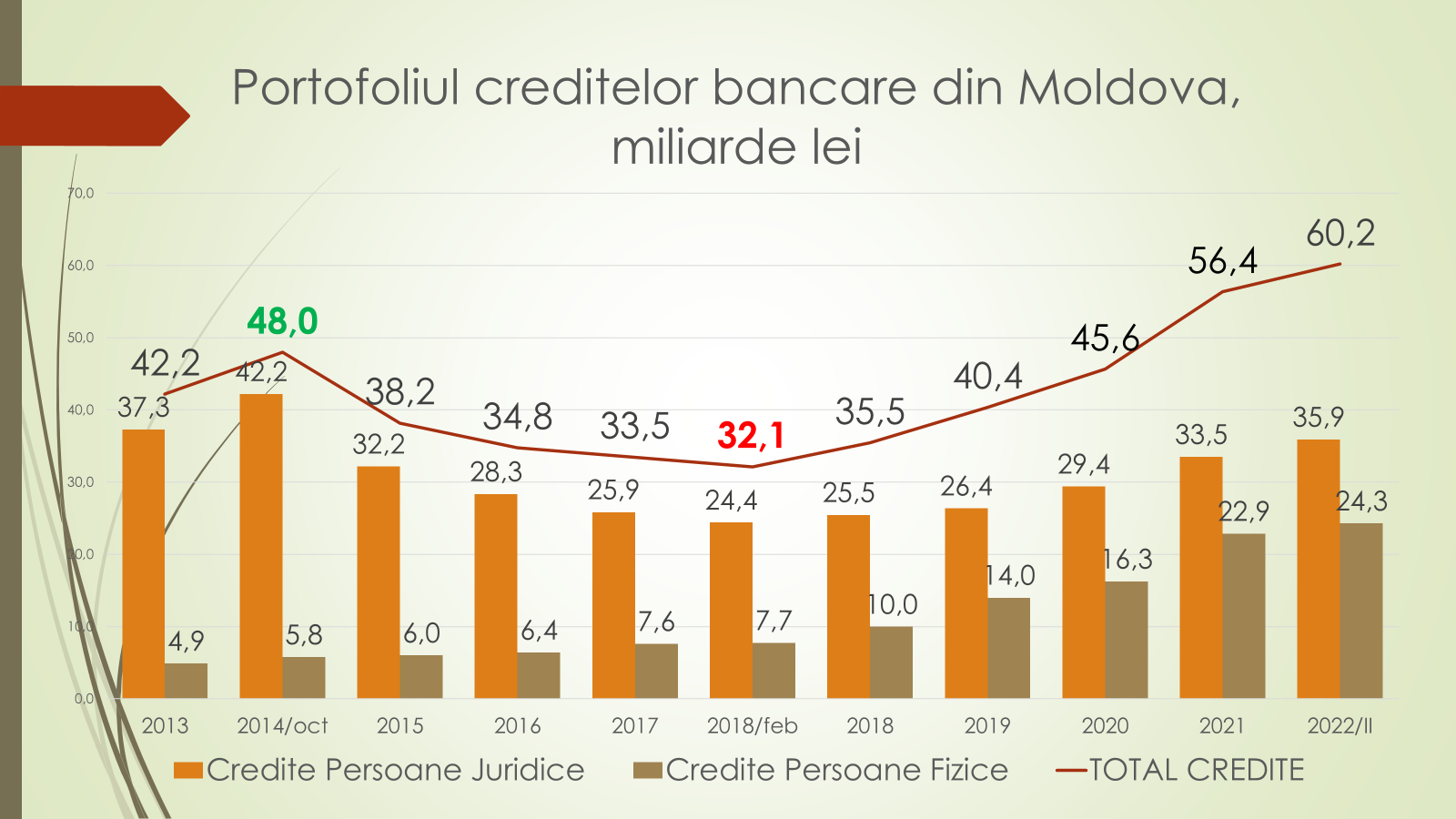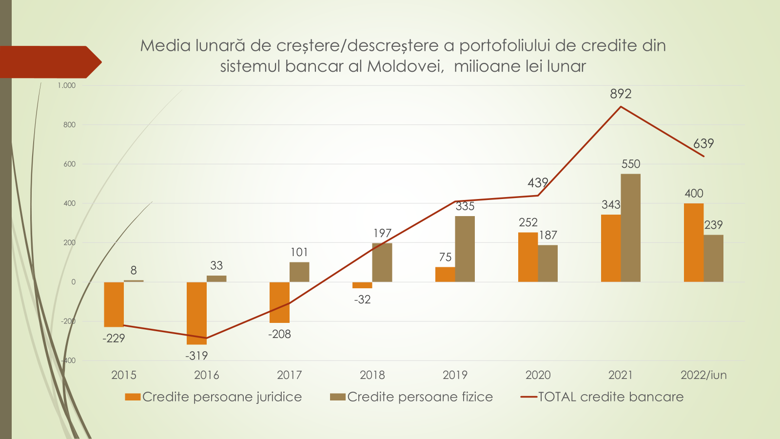 „Avem o schimbare a focusului. În prezent agenții economici se împrumută din ce în ce mai mult de la bănci. În jumătate de an volumul creditelor a crescut cu 3,6 miliarde de lei, de la 56,4 la 60,2 miliarde de lei. Însă, spre deosebire de alți ani, această creditare în acest an este dominată de creditele luate de către persoanele juridice, care au luat 2,2 miliarde de lei, iar persoanele fizice 1,4 miliarde de lei”, a afirmat economistul.