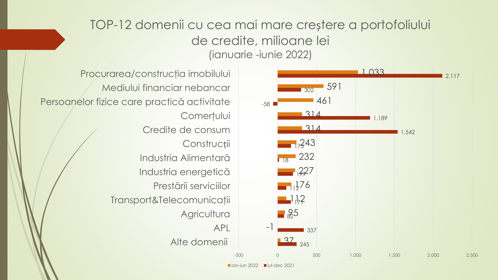 Expertul susține cu sunt 12 domenii care s-au manifestat cel mai mult în prima jumătate a acestui an în ceea ce privește creditarea. În primul este vorba de procurarea imobilului. Aici creditele noi luate s-au majorat cu un miliar de lei, de două ori mai puțin decât anul trecut. Pe locul doi se află instituțiile financiare nebancare. Acestea au luat credite din bănci de 590 de milioane de lei, comparativ cu 300 de milioane de lei în prima jumătate a anului trecut. Acum, sectorul nebancar oferă populației credite mult mai scump decât acordau anterior. A crescut puternic creditele luate de către populație pentru a începe o activitate economică. De la o creștere de 58 de milioane de lei anul trecut la 460 de milioane de lei în acest an. În general, remarcă expertul, creditele luate de către populație pentru activități economice este la un nivel scăzut. A fost cândva 2 miliarde de lei, a scăzut la un miliard de lei, și acum înregistrează o creștere promițătoare.