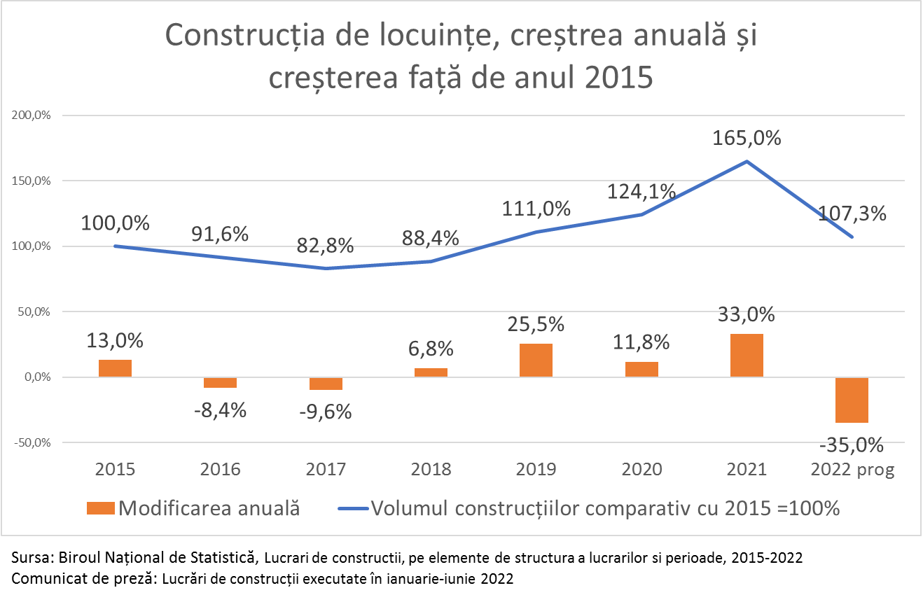Estimăm că în 2022 construcția de locuințe se va reduce cu cel puțin 35% comparativ cu anul precedent. Astfel după o creștere puternică timp de 4 ani, piața construcțiilor, după cum am anticipat încă anul trecut în 2022 a decis să facă o mică pauză.