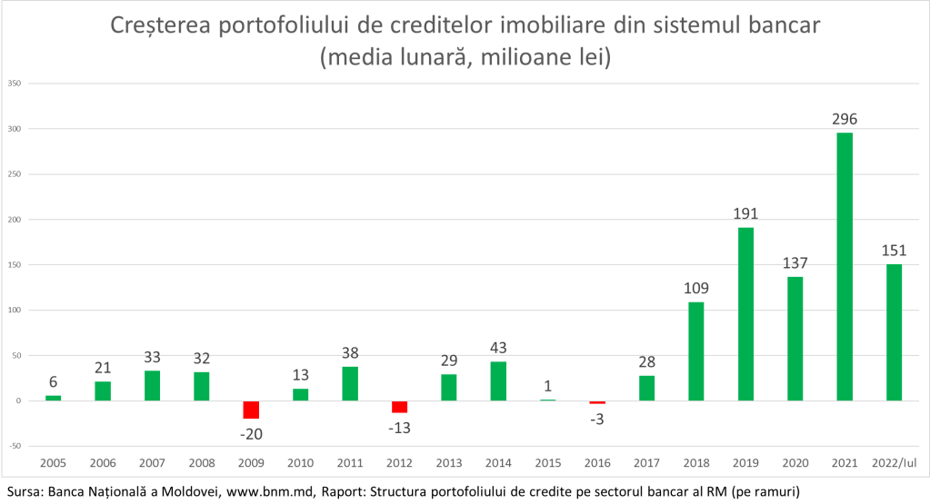În perioada 2018-2021de la 20% până la 30% din apartamentele procurate au fost procurate prin ipotecă. În acest an, piața creditelor ipotecare crește de 2 ori mai lent decât anul trecut, când lunar ea creștea cu 296 milioane lei. În primele 7 luni ale anului creșterea medie lunară este de 151 milioane lei și cu o tendință clară de încetinire.