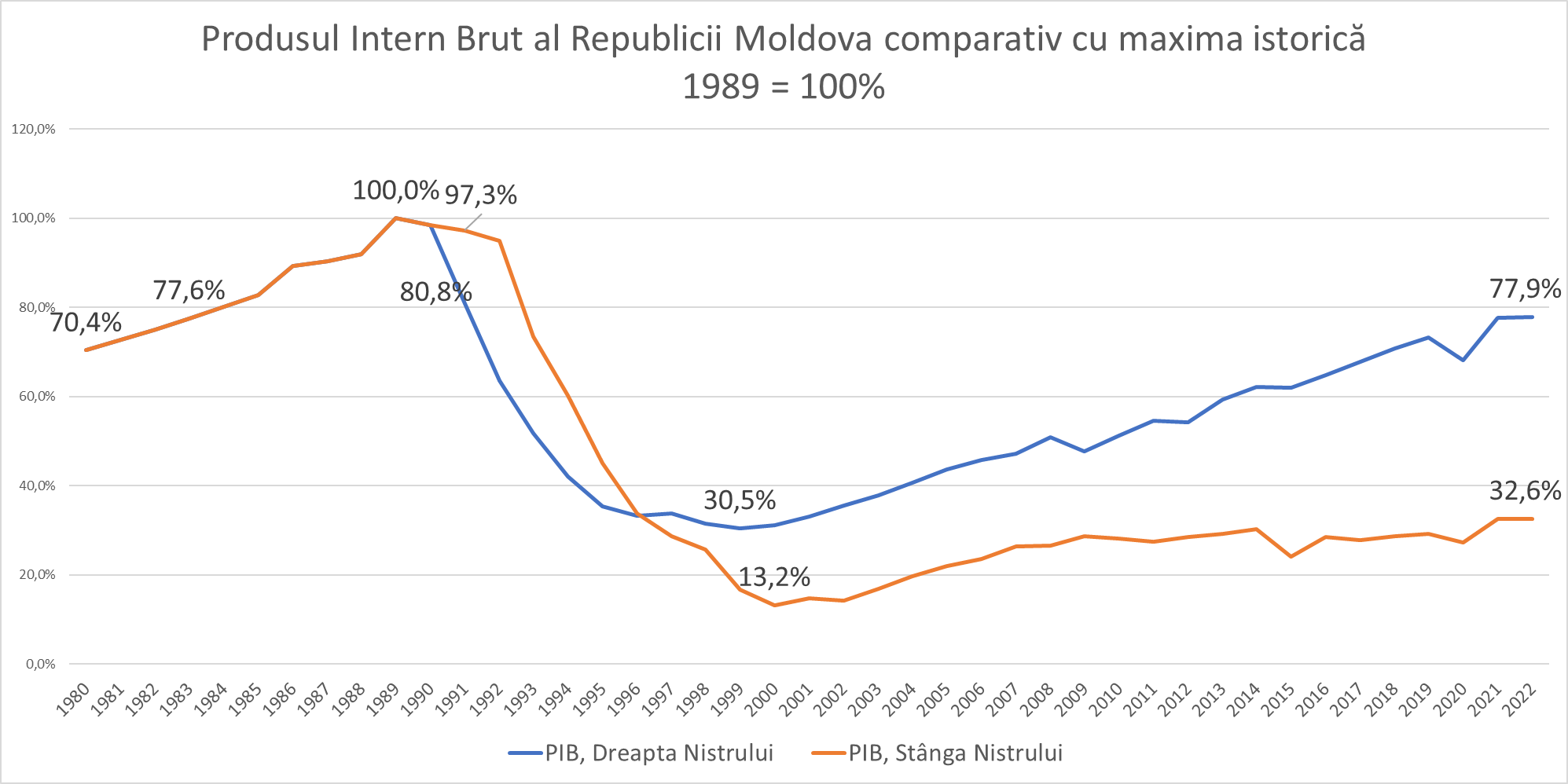 În stânga Nistrului căderea a întârziat atunci cu un an, dar prăbușirea a fost mult mai puternică. În prezent PIB-ul din stânga Nistrului constituie doar 32,6% sau de 3 ori mai puțin decât nivelul anului 1989. În prezent PIB-ul din stânga Nistrului este la nivelul anului 1965.