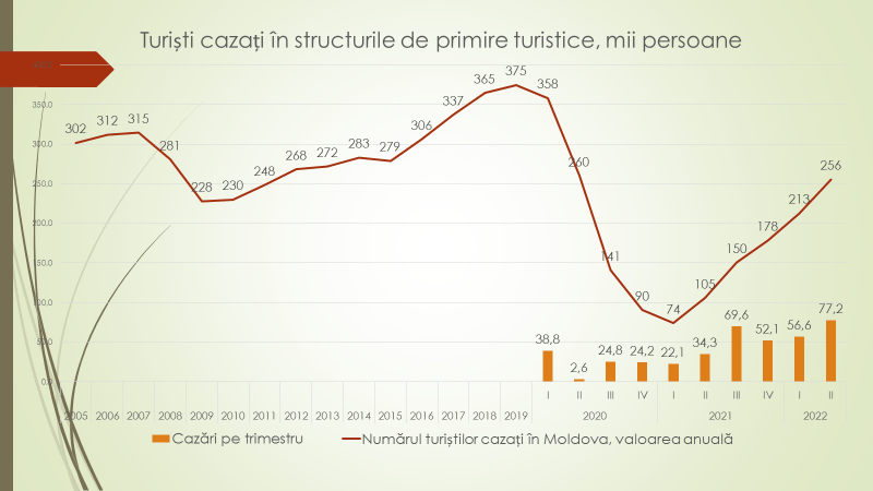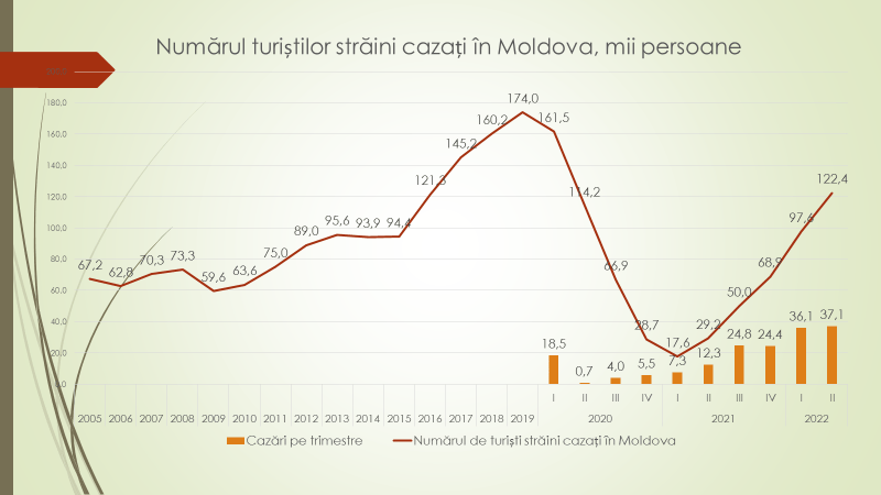 Potrivit expertului, Republica Moldova în 2019, până la pandemie, a avut 375 de mii de turiști, atât străini, cât și localnici. În primul trimestru din 2021, din cauza pandemiei, numărul lor a scăzut la 74 de mii. În trimestrul II din 2022 numărul celor care au vizitat Republica Moldova, în valoare anuală, a crescut la 256 de mii. Expertul crede că până la jumătatea anului viitor numărul turiștilor va reveni la situația de până la pandemie. „Noi am avut turiști străini în Republica Moldova anual câteva 174 de mii. Acum s-a ajuns la 122 de mii, iar tendința este una pozitivă. Partea proastă este că moldovenii, cred că este vorba de o continuare a crizei, încă ezită să meargă la odihnă”, a spus expertul.