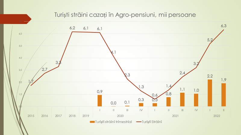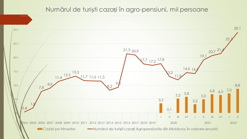 Economistul afirmă că în primul trimestru al anului curent a fost bătut un record al numărului de vizite în pensiuni, de 7 mii de persoane. În trimestrul II – de 8,8 mii persoane, incomparabil cu oricare alt trimestru din istoria Republicii Moldova, ceea ce înseamnă că după pandemie în domeniul turismului rural s-au petrecut lucruri interesante. Din acest motiv, afirmă economistul, această ramură merită toată atenția. „Aceasta este unica ramură care repede s-a recuperat. Acum am ajuns la 29 de mii de turiști în valoare anuală, cazați în pensiunile noastre. Până la sfârșitul anului, dacă lucrurile merg tot așa, ne vom apropia de 40 de mii sau dublu față de ceea ce a fost până la pandemie”, a afirmat economistul.
