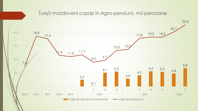 Analistul economic menționează că cel mai mult se odihnesc în pensiuni moldovenii. În trimestrul I din 2022 numărul acestora a fost de 4,8 mii de persoane, iar în trimestrul II – 6,8 mii de persoane. În ultimele 12 luni, numărul localnicilor care au vizitat pensiunile a fost de 22,8 mii de persoane. Dacă în mod normal ei sunt 10% din toți turiștii care vizitează pensiunile, în timpul pandemiei aceștia au reprezentat 20%.