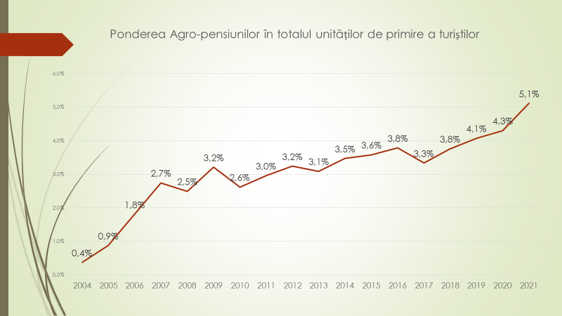 Un alt record ține de numărul locurilor de cazare în pensiunile rurale, care a crescut cu peste 20%. În 2021 au fost 1221 de locuri, în 2020 – 1061 de locuri, iar în 2019 au fost 999 de locuri. Astfel, pensiunile dețin în prezent 5% din numărul total de locuri în ramura turismului. Totodată, în perioada pandemică pensiunile au ajuns să dețină până la 20% din cota de piață. Zece ani în urmă era 3%. În perioada pandemiei, pensiunile au fost unicele care au reușit să funcționeze, cu excepția primului trimestru de pandemie. „Pandemia a schimbat comportamentul cetățenilor moldoveni. Mulți nu au putut pleca peste hotare, s-au odihnit în Republica Moldova, iar mulți deja privesc pensiunile ca o formă de odihnă, inclusiv în zilele de odihnă”, a menționat analistul economic.