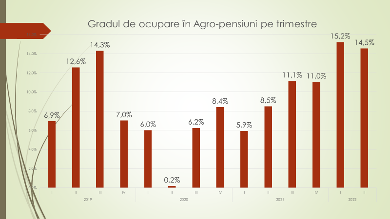 Veaceslav Ioniță a mai spus că în 2019, înainte de pandemie, două lucruri erau clare. În primul și ultimul trimestru al anului era un grad de ocupare de 6-7% al locurilor de cazare în pensiuni. În perioada caldă gradul de ocupare ajungea la 12,6%-14%. Anul acesta, pentru prima dată s-a rupt diferența dintre iarna și vara. În primul trimestru din acest an gradul de ocupare a fost de 15%, în trimestru II – de 14,5%. „Pensiunile au devenit un punct de destinație indiferent de anotimp. Oamenii se odihnesc și vara și iarna”, a spus Veaceslav Ioniță.