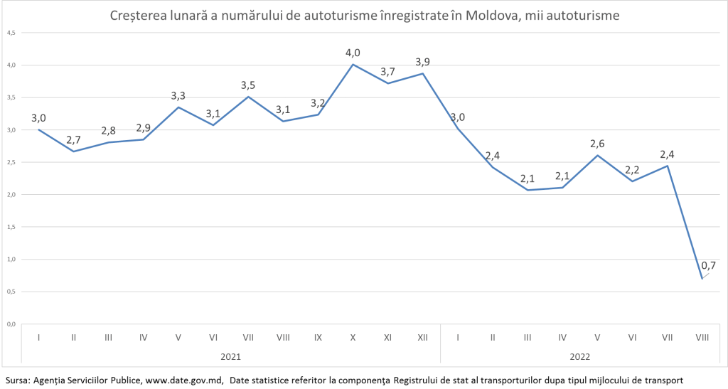 În august 2022, numărul automobililor înregistrate în Moldova a crescut cu 700 unități, cea ce este de 4 ori mai puțin decât media obișnuită din ultimul an de 2,9 mii unități lunar.