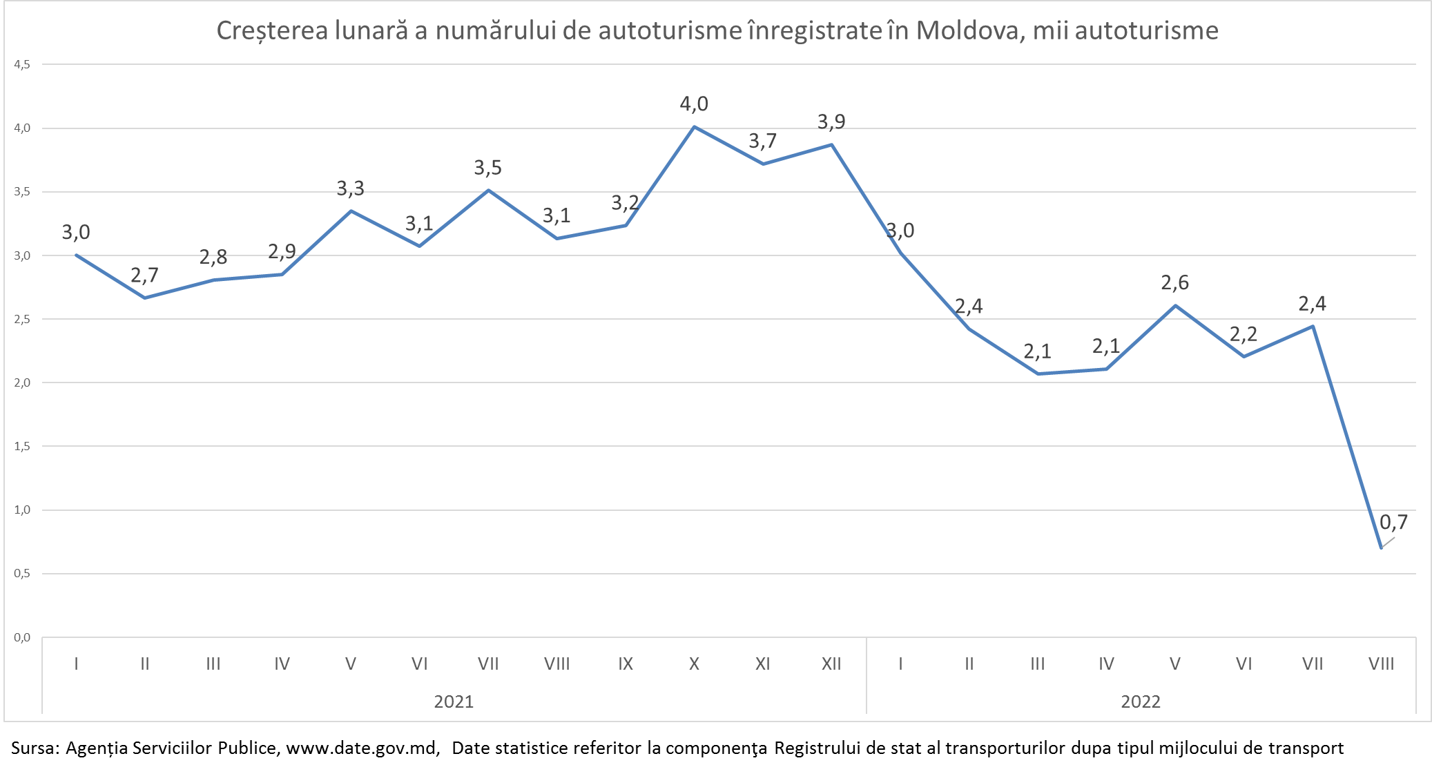 În august 2022, numărul automobililor înregistrate în Moldova a crescut cu 700 unități, cea ce este de 4 ori mai puțin decât media obișnuită din ultimul an de 2,9 mii unități lunar.