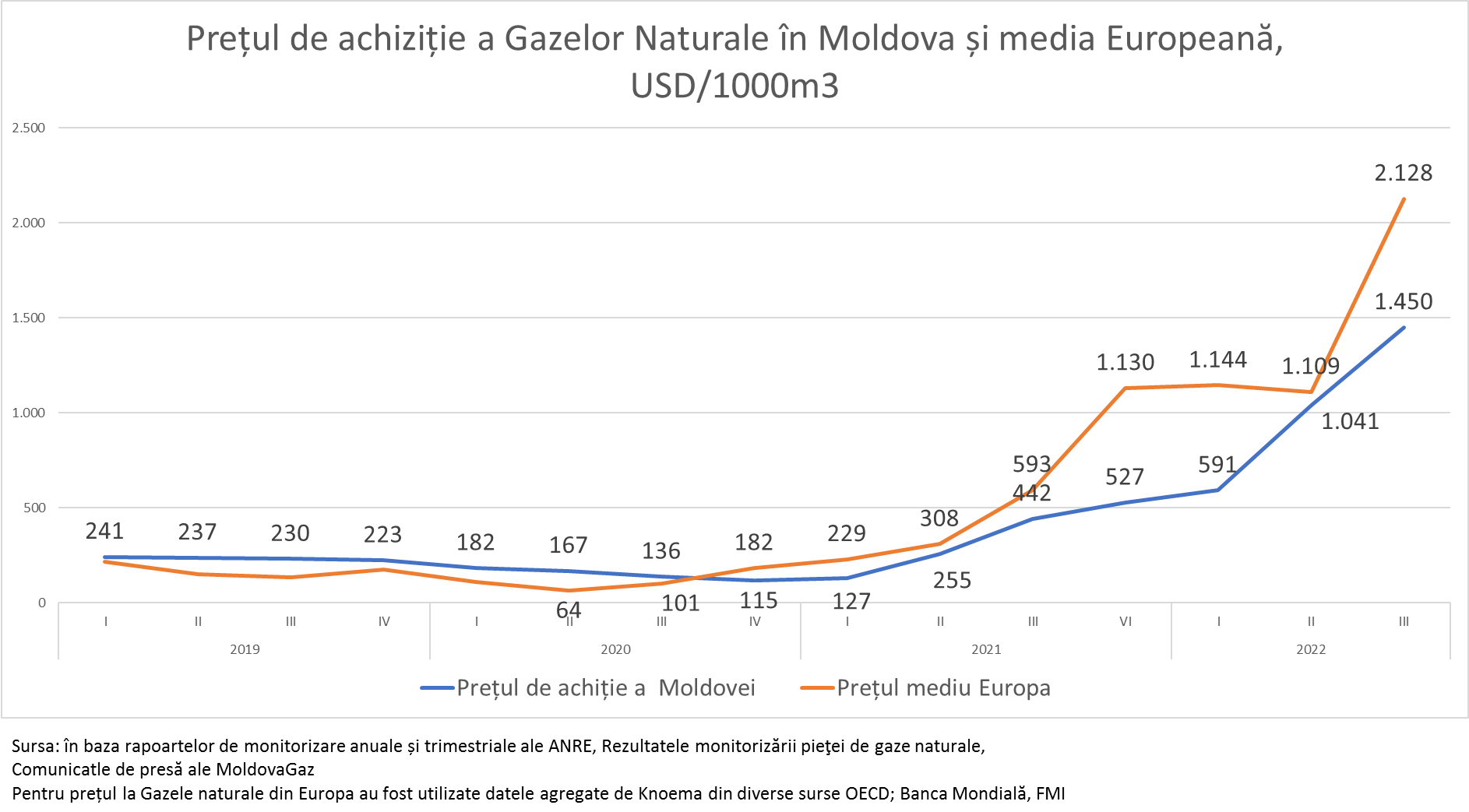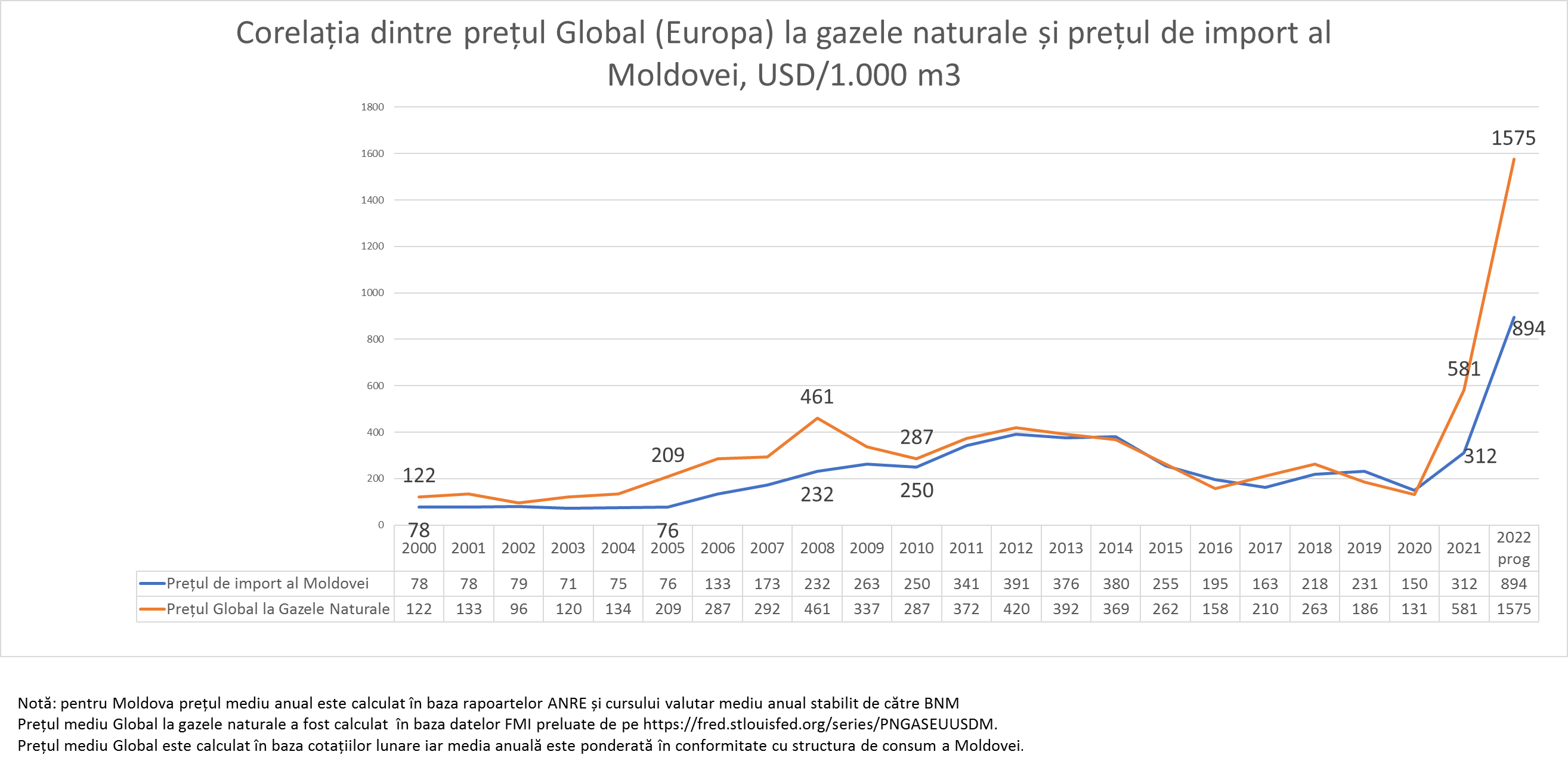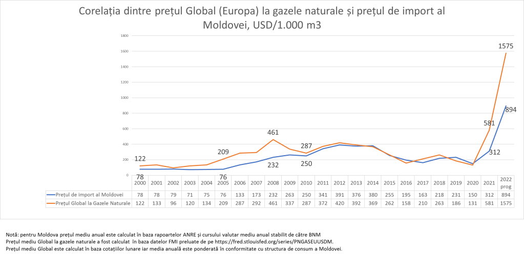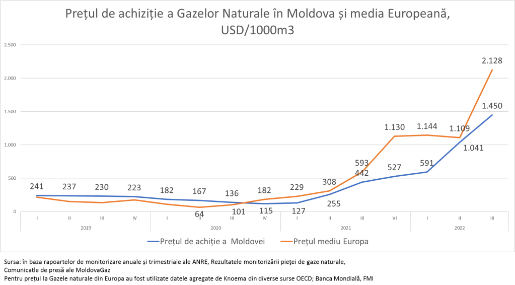 Pentru tr. IV din acest an anticipăm că Moldova va avea un preț mediu de achiziție de circa 1.100 USD/1000m3, cea ce va duce la un preț mediu anual de 894 USD/1000m3. Astfel prețul mediu anual în 2022 va fi de 6 ori mai mare decât prețul mediu anual din 2020 și de 3 ori mai mare decât în 2021.