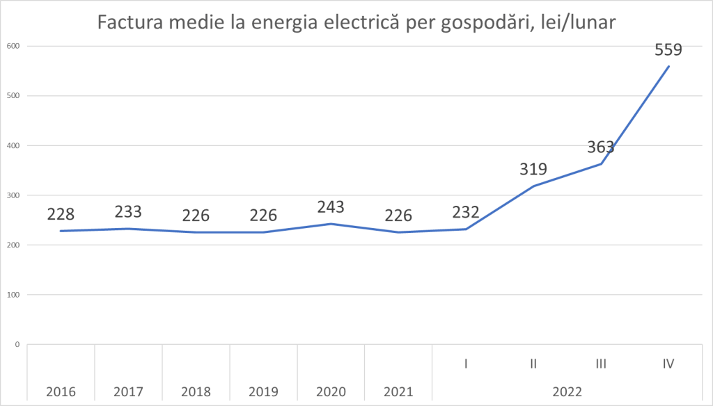 În acest an am avut deja 4 majorări de tarife și drept consecință în trimestrul IV din acest an, dacă nu vor urma noi majorări, factura medie la electricitate o estimăm la 559 lei/lunar, sau de 2,5 ori mai mult decât acum un an.