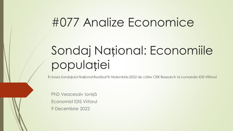Economiile cetățenilor Republicii Moldova în prezent sunt estimate la 104 miliarde de lei, dintre care 33,3 miliarde de lei sunt ținuți la bănci, iar 20,5 – acasă. Restul 50,1 miliarde de lei sunt în valută străină, dintre care: 21,1 miliarde lei în bănci, iar 29 – acasă. Veaceslav Ioniță, expert în politici economice la Institutul pentru Dezvoltare și Inițiative Sociale (IDIS) „Viitorul”, a spus în cadrul ediției de vineri, 9 decembrie, a emisiunii „Analize economice cu Veaceslav Ioniță”, că la această concluzie s-a ajuns ca urmare a unui sondaj realizat de către CBS-Research, la comanda IDIS „Viitorul”.