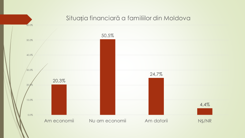 Potrivit sondajului, referitor la situația familiei, 50,5% dintre respondenți au spus că nu au economii, iar 24,7% – că au datorii și doar 20,3% – au economii. „Deci, prima constatare este că fiecare al cincilea cetățean din Republica Moldova are economii, iar 80% din populație nu are nici un fel de economii, pentru nici un fel de eveniment”, a specificat Veaceslav Ioniță.