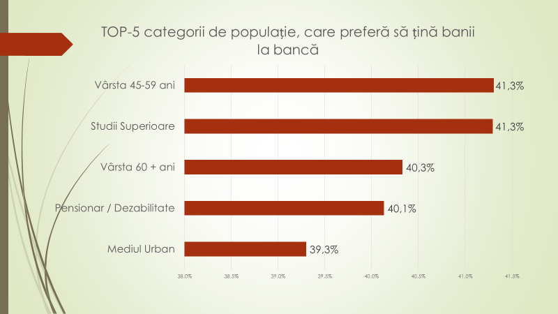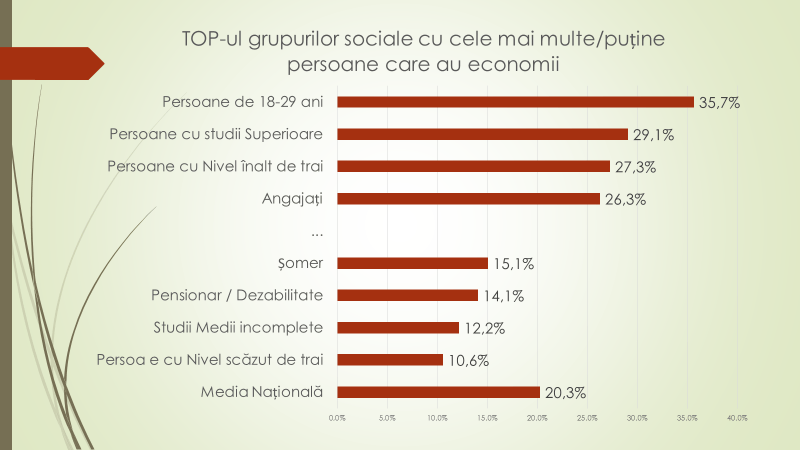 Totodată, 35,7% dintre cei care au înclinație spre a face economii sunt tinerii de la 18 la 29 de ani. Urmează în ordine cei cu studii superioare – 29,1%, cu un nivel înalt de trai – 27,3%, și angajații, care reprezintă 26,3%. La polul opus, cele mai puține economii le au persoanele cu nivel scăzut de trai – 10,6%, moldovenii cu studii medii incomplete – 12,2%, pensionarii/persoanele cu dizabilități – 14,1%, și șomerii – 15,1%. „Oamenii cu studii, cu venituri, se gândesc cum să economisească, dar și au posibilitatea să facă aceste economii”, a precizat expertul IDIS „Viitorul”.