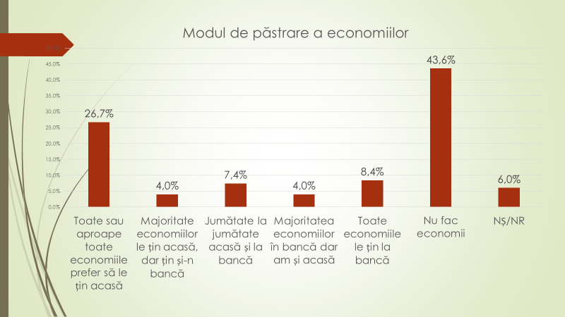 Cât privește modul în care moldovenii își țin banii, sondajul arată 43,6% dintre moldoveni nu fac economii. 26,7% au spus că preferă să țină toate sau aproape toate economiile acasă. 8,4% dintre moldovenii au declarat că preferă să-și țină economiile la bancă. 7,4% – jumătate la bancă și jumătate acasă. Alții 4% au spus că mai mult acasă, dar țin și la bancă, și tot 4% au menționat că majoritatea economiilor sunt la bancă, dar au și acasă. Astfel, despre locul în care moldovenii preferă să-și țină economiile: 64% – casă, 36% – la bancă.