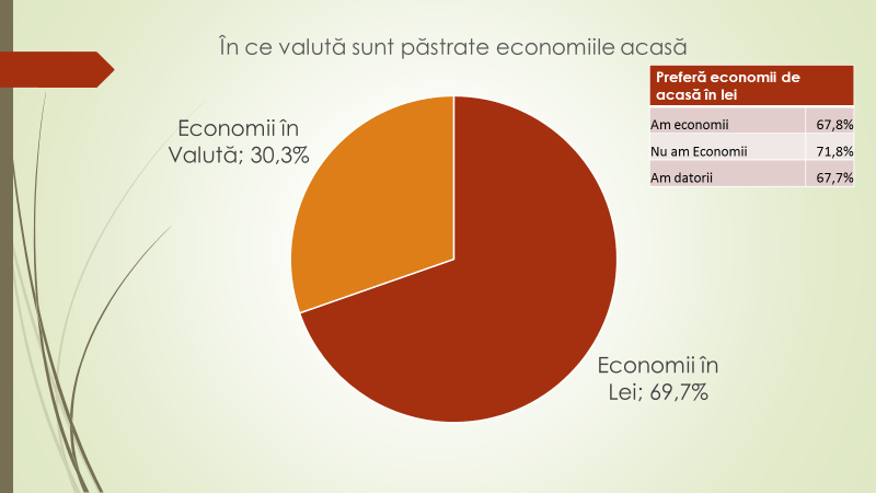 Potrivit sondajului, 40,2% dintre respondenți au afirmat că preferă să țină banii în lei; 30,6% nu au oferit un răspuns; 14,4% – în egală măsură în lei și valută; 6,4% – majoritatea în valută; 4,5% – mai mult în lei, dar și în valută; 3,9% – în valută, dar și în lei. „Circa 70% dintre economiile pe care oamenii le țin acasă sunt în lei, iar 30% – în valută. Indiferent de faptul dacă au sau nu au economii, preferințele sunt aceleași, mai mult în lei și mai puțin în valută” a subliniat Veaceslav Ioniță.