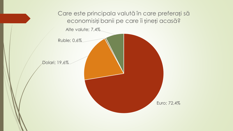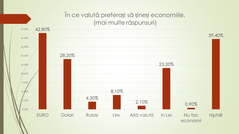 La întrebarea în ce valută preferă să țină banii, 43,8% au afirmat că preferă în euro; 39,4% nu au oferit un răspuns; 28,2% – în dolari; 23,2% – în lei; 8,1% – lire; 4,3% – ruble, 2,1% – altă valută. Astfel, 72,4% dintre toate economiile în valută ale populației noastre sunt în euro, 19,6% – în dolari, 7,4% – alte valute și doar 0,6% – în ruble.