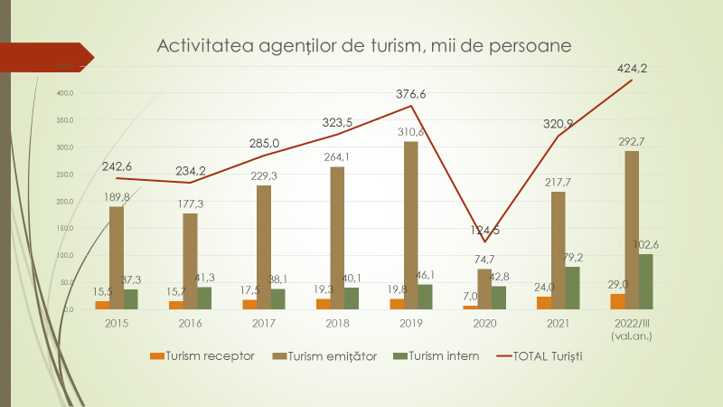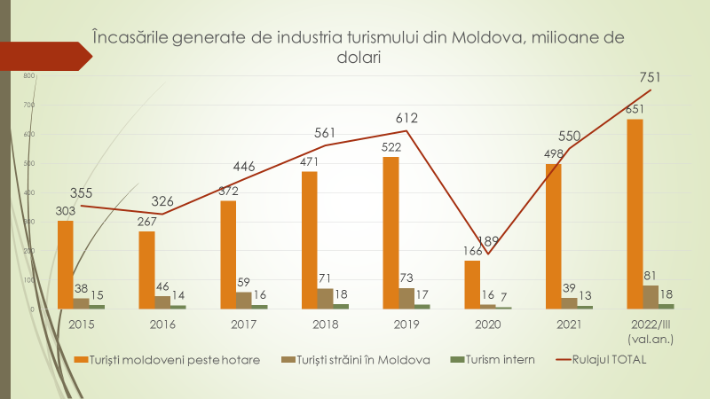 Turismul în Republica Moldova se recuperează tot mai mult de pe urma pandemiei. În acest an, evoluția se datorează exclusiv turismului intern și pensiunilor. Veaceslav Ioniță, expert în politici economice la Institutul pentru Dezvoltare și Inițiative Sociale (IDIS) „Viitorul”, a spus în cadrul ediției de vineri, 16 decembrie, a emisiunii „Analize economice cu Veaceslav Ioniță”, că oficial, în 2022, Republica Moldova a înregistrat peste 424 de mii de turiști, dintre care aproape 103 mii au promovat turismul intern, ceea ce este cu 50% mai mult decât recordul stabilit în 2020.