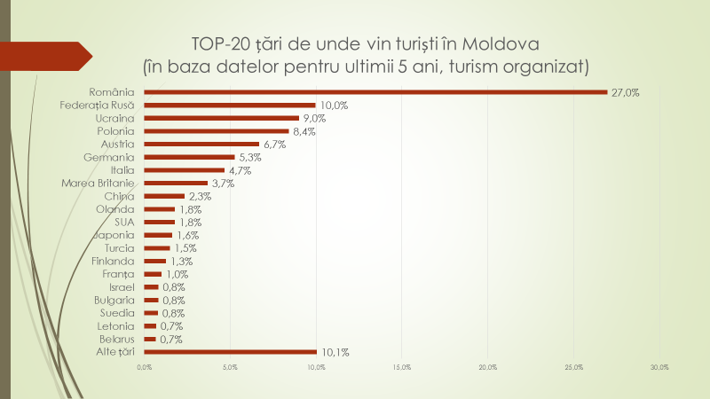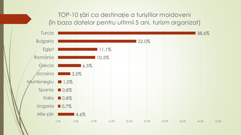„Datele din ultimii cinci ani arată că majoritatea moldovenilor pleacă la odihnă în Turcia – 38,6%. Pe locul II este Bulgaria – 22%, pe locul III Egipt – 11,1% și pe locul IV România – 10%. Aceste țări i-au peste 80% din cota turiștilor care merg oficial. Dacă luăm neoficial, în cercetarea noastră pe primul loc se află detașat Ucraina. Dacă ne uităm la cei care vin în Republica Moldova, atunci pe primul loc vin din România – 27%, pe locul II vin din Federația Rusă – 10%, apoi urmează Ucraina, Polonia, Austria etc”, a menționat Veaceslav Ioniță.