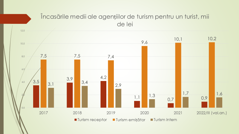 Economistul a afirmat că dacă în 2017, o agenție de turism din Republica Moldova câștiga de pe urma unui moldovean plecat peste hotare în vacanță 7500 de lei, după 2020, încasările au ajuns la aproape 10 mii de lei. În cazul turiștilor străini, dacă plăteau în aceiași perioadă vreo 4 mii de lei, acum indicele a coborât la 1000 de lei. De asemenea, încasările medii ale agențiilor de turism au scăzut de la 3500 de lei la aproape 1500 de lei și pentru moldovenii care se odihnesc în Republica Moldova.