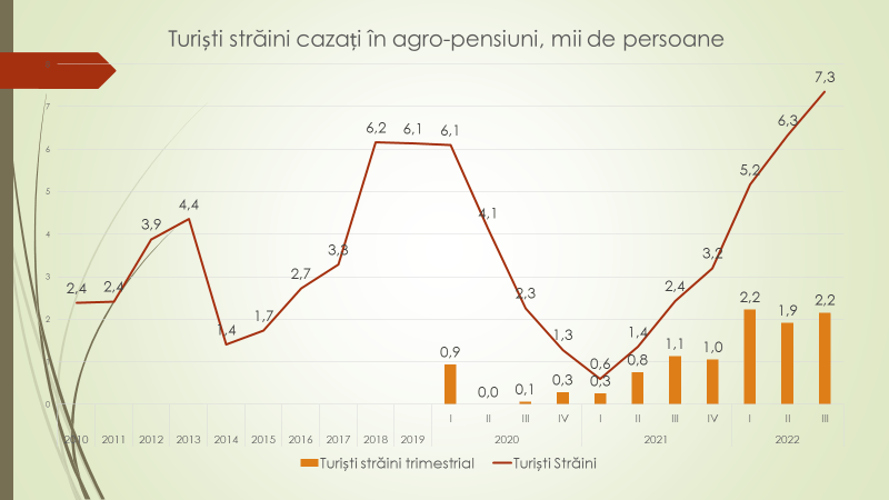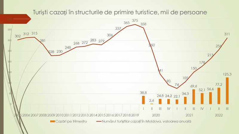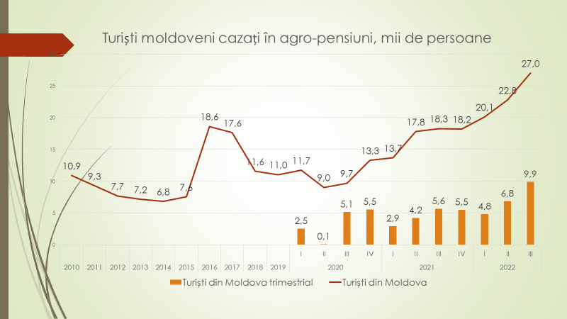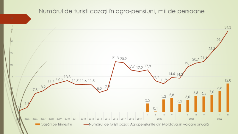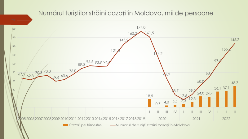 Un rol important la dezvoltarea turismului intern îl au, potrivit analistului economic, pensiunile. În acest an, din cei 34 de mii de turiști care au fost în pensiuni, 26 de mii sunt moldoveni. „În trimestrul III am avut aproape 10 mii de moldoveni care sau odihnit în pensiuni, ceea ce este de 2 ori mai mult decât maximele care au fost până în prezent. Practic, în acest an avem o creștere fără precedent. Am avut o creștere în 2020, care a fost determinată de pandemie, când oamenii nu puteau pleca peste hotare și s-au odihnit acasă. Acum, presupun, războiul a influențat acest lucru. Dacă ne uităm la străini, tot în acest an am atins deja recordul. În 2018-2019 am avut cam 6 mii de străini care se odihneau în Republica Moldova și în acest an deja am trecut de 7300 și cred că vom ajunge la 8500 până la sfârșitul anului, ceea ce va însemna o creștere de 40% comparativ cu maxima care a fost de până la pandemie”, a subliniat Veaceslav Ioniță.