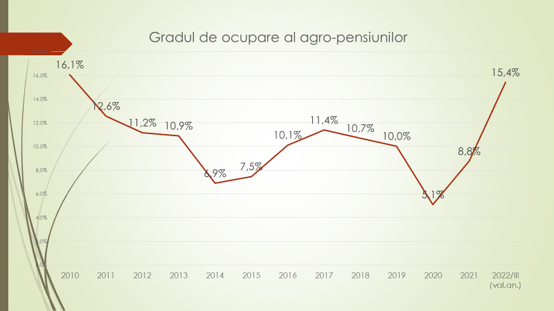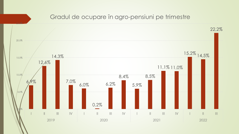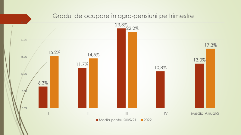 Expertul a mai menționat că în 2004, în Republica Moldova, erau 88 de pensiuni, în acest an există 1280. O creștere de 15 ori în 17 ani. Dacă în 2004, ele reprezentau 0,4% din toată capacitatea Republicii Moldova de cazare, în acest an ajunge la circa 6%. Totuși, problema principală rămâne asigurarea capacității de cazare, în condițiile în care în acest an, media anuală este de doar 15,4%. „O pensiune ca să poată supraviețui este bine ca gradul ei de încărcare să fie de minimul 40%. Acum are 15,4%. Asta înseamnă că din șase zile, doar o zi, pensiunile sunt pline sau din șase camere doar o cameră este cu oaspeți. Acest lucru este de trei ori mai puțin decât media necesară”, a explicat expertul.